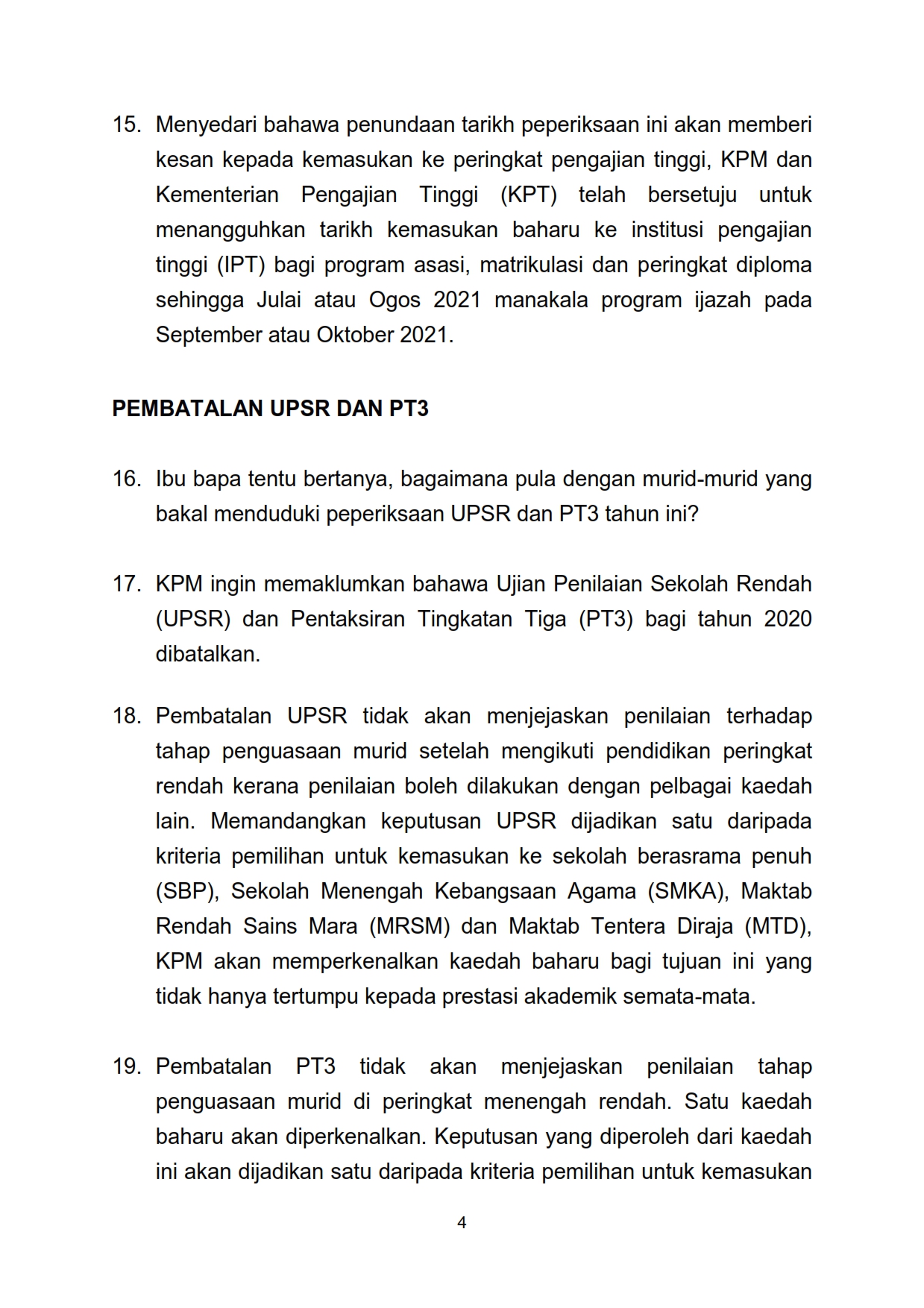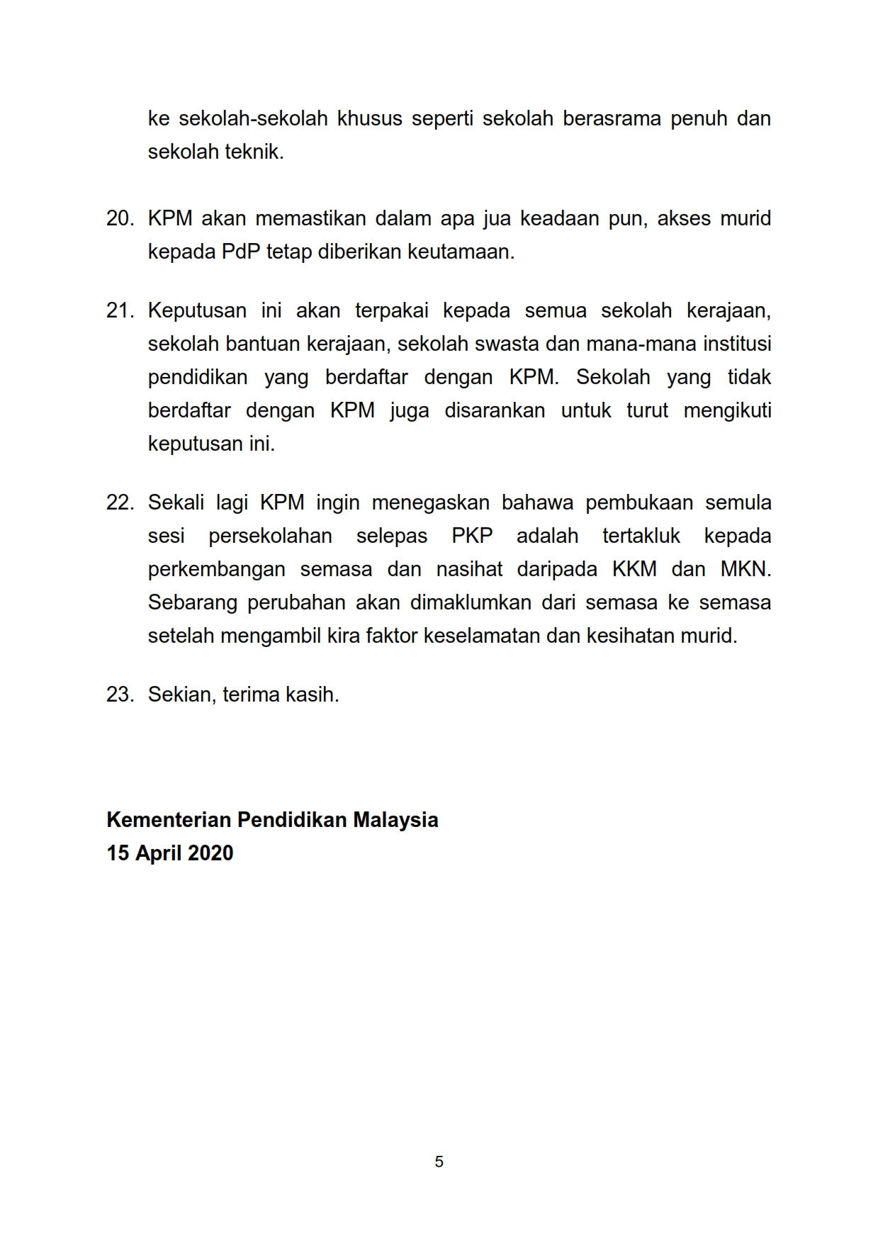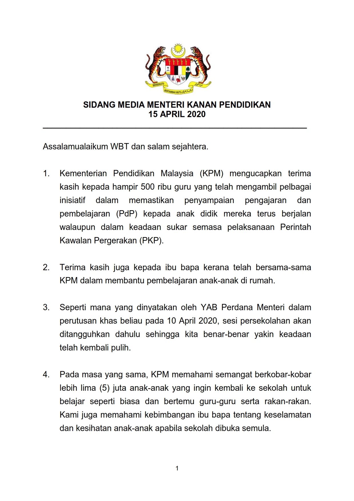 Siaran Media - Menteri (Kanan) Pendidikan Malaysia 15/04/2020 Asrul Siaran Media 15 April 2020 Jumlah paparan: 793 Rating: ( 0 Rating ) Sila beri kadar Undi 1 Undi 2 Undi 3 Undi 4 Undi 5 Lihat / Muat Turun PDF Facebook Twitter Seterusnya Seterusnya