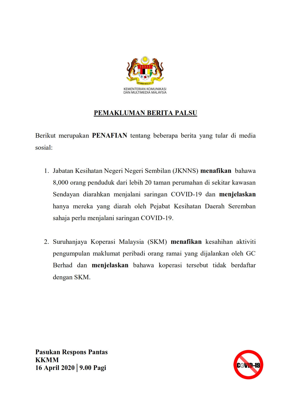 Pemakluman Berita Palsu SKMM 16/04/2020 0900 AM Asrul Siaran Media 16 April 2020 Jumlah paparan: 587 Rating: ( 0 Rating ) Sila beri kadar Undi 1 Undi 2 Undi 3 Undi 4 Undi 5 Lihat / Muat Turun PDF Facebook Twitter Seterusnya Seterusnya