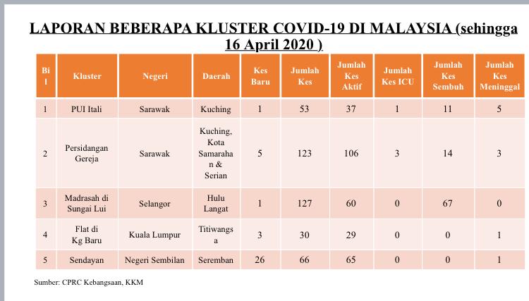 Laporan Beberapa Kluster COVID-19 Di Malaysia 16/04/2020 Asrul Siaran Media 16 April 2020 Jumlah paparan: 815 Rating: ( 0 Rating ) Sila beri kadar Undi 1 Undi 2 Undi 3 Undi 4 Undi 5 Lihat / Muat Turun JPG Facebook Twitter Seterusnya Seterusnya