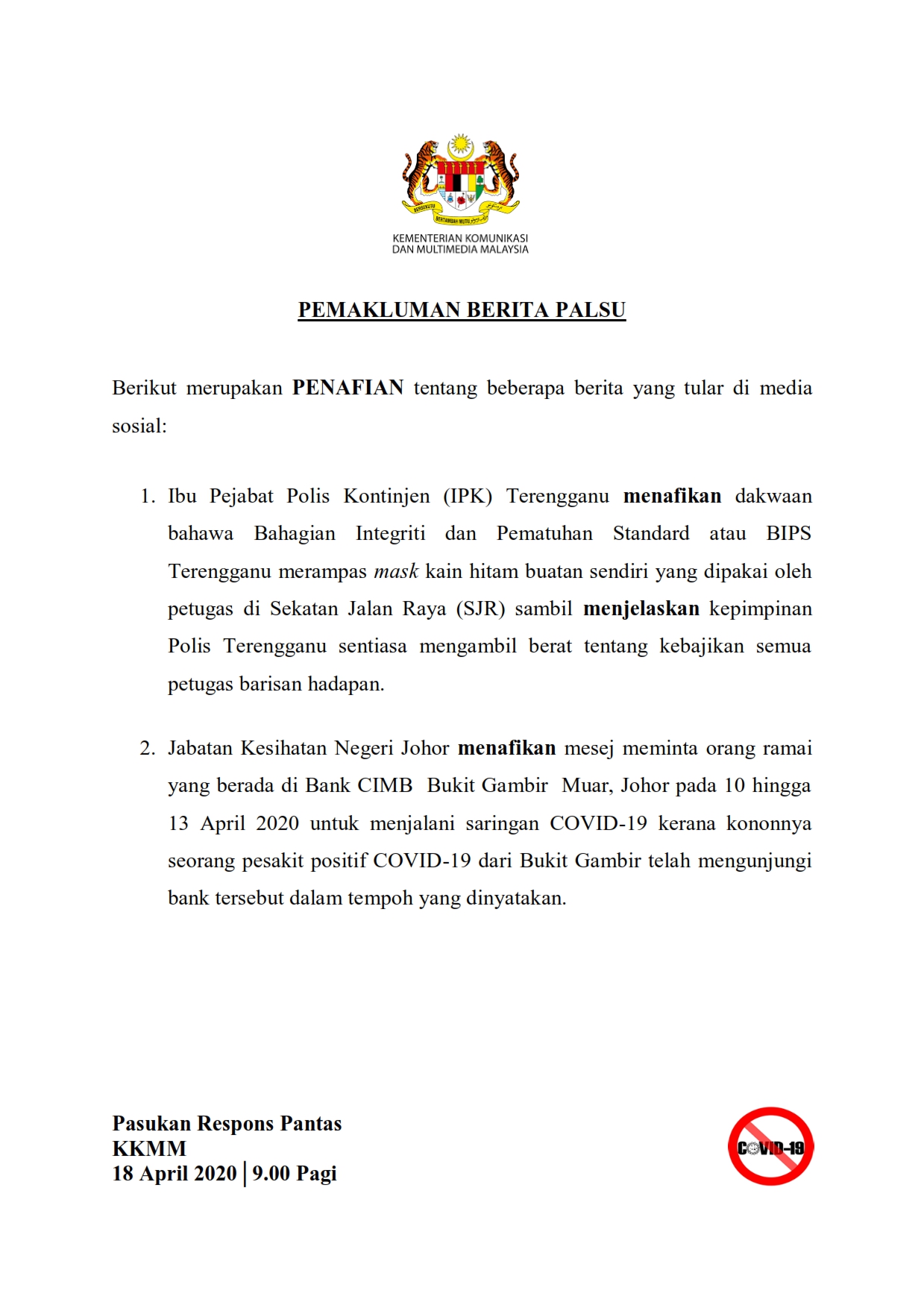 Pemakluman Berita Palsu SKMM 18/04/2020 0900 AM Asrul Siaran Media 18 April 2020 Jumlah paparan: 859 Rating: ( 0 Rating ) Sila beri kadar Undi 1 Undi 2 Undi 3 Undi 4 Undi 5 Lihat / Muat Turun PDF Facebook Twitter Seterusnya Seterusnya