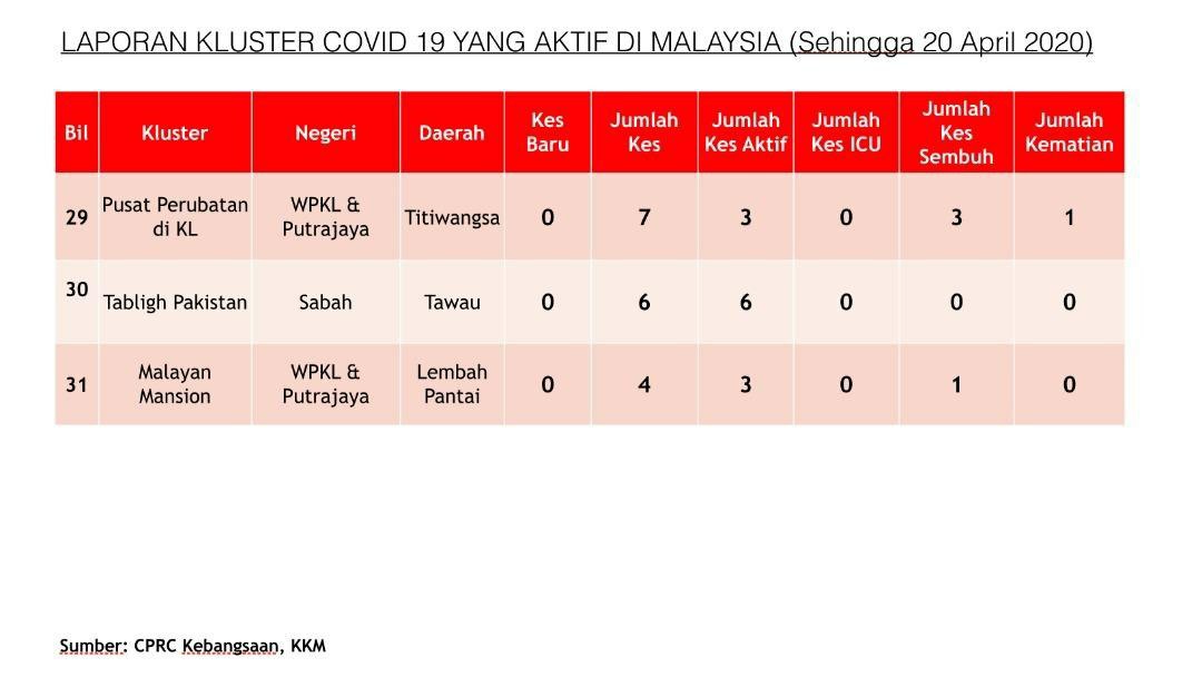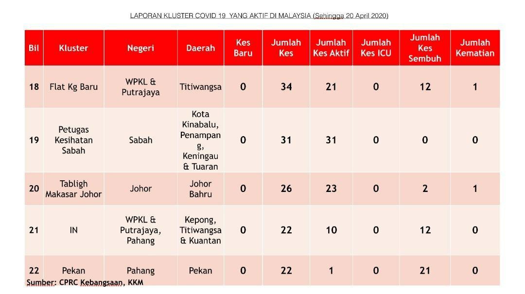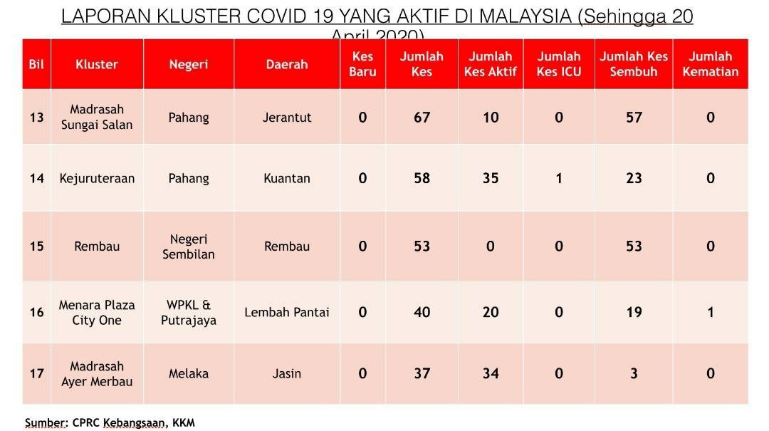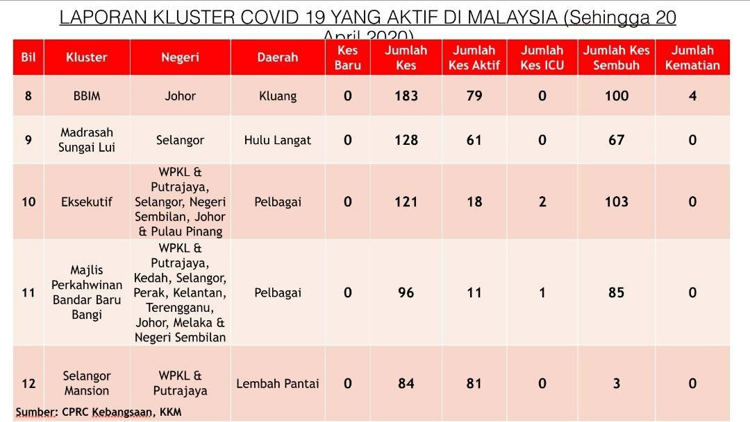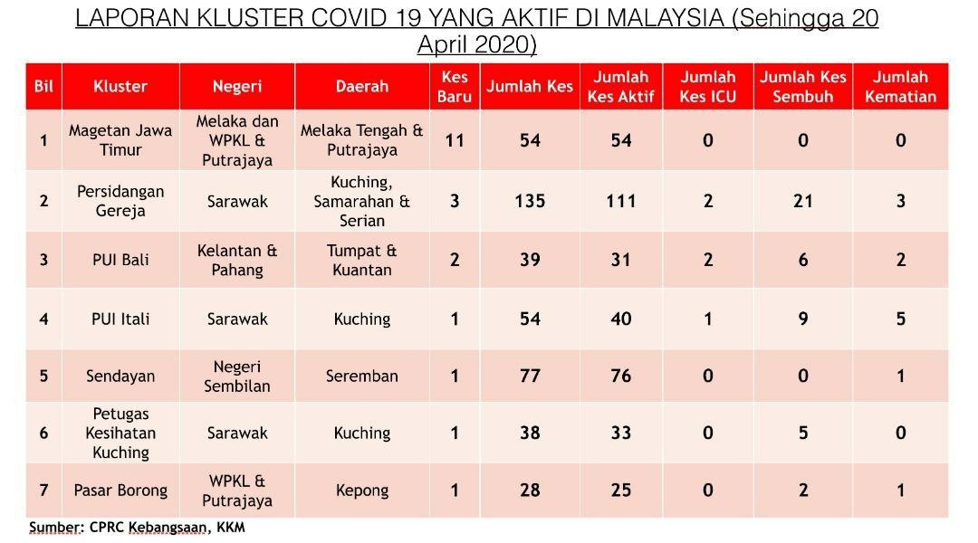 Laporan Kluster COVID-19 Di Malaysia 20/04/2020 Asrul Siaran Media 20 April 2020 Jumlah paparan: 805 Rating: ( 0 Rating ) Sila beri kadar Undi 1 Undi 2 Undi 3 Undi 4 Undi 5 Facebook Twitter Seterusnya Seterusnya