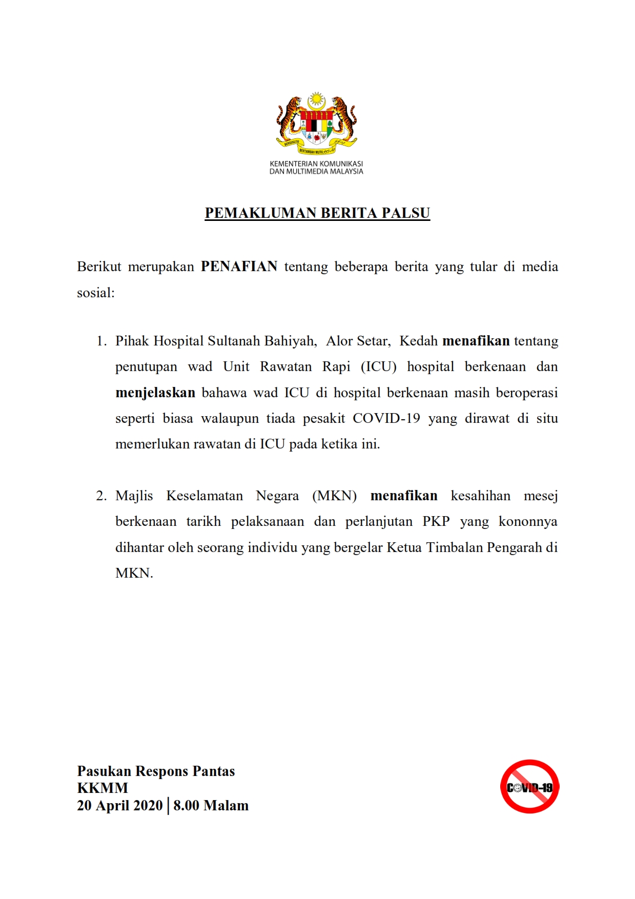 Pemakluman Berita Palsu SKMM 20/04/2020 0800 PM Asrul Siaran Media 20 April 2020 Jumlah paparan: 636 Rating: ( 0 Rating ) Sila beri kadar Undi 1 Undi 2 Undi 3 Undi 4 Undi 5 Lihat / Muat Turun PDF Facebook Twitter Seterusnya Seterusnya
