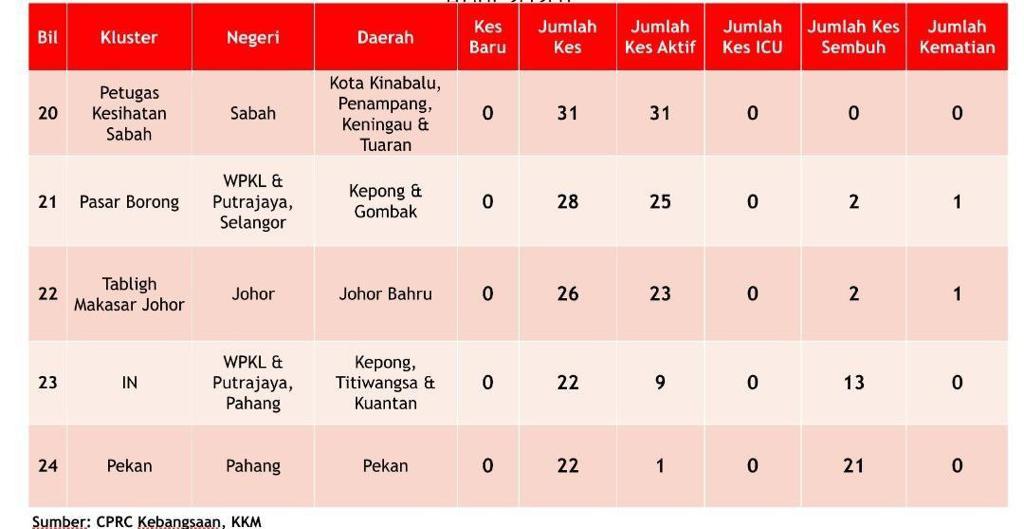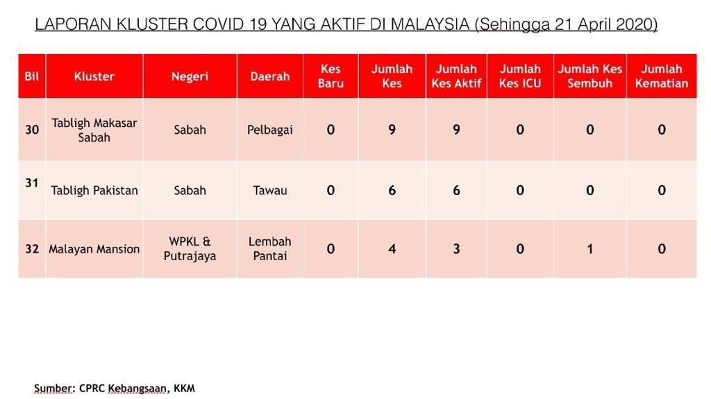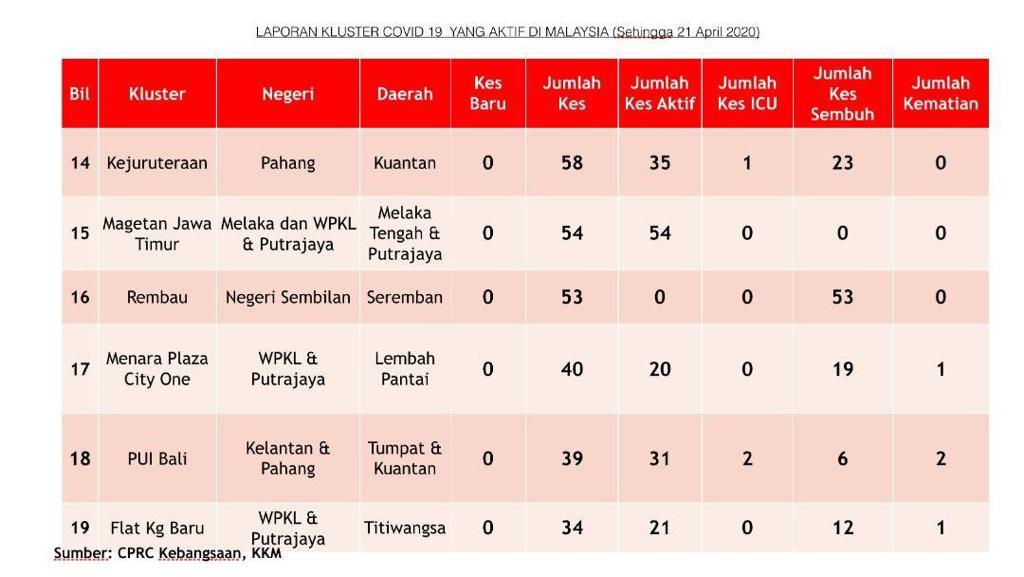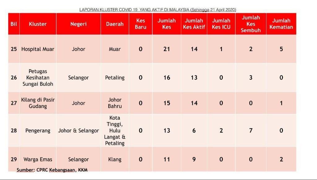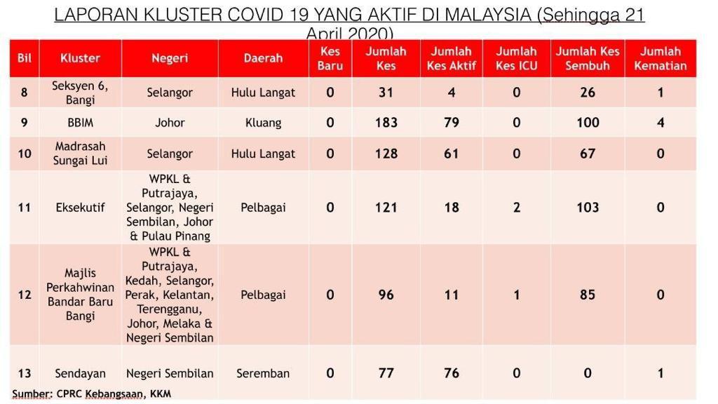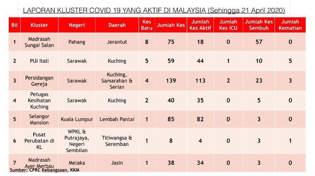 Laporan Kluster COVID-19 Di Malaysia 21/04/2020 Aiman Siaran Media 20 April 2020 Jumlah paparan: 1274 Rating: ( 0 Rating ) Sila beri kadar Undi 1 Undi 2 Undi 3 Undi 4 Undi 5 Facebook Twitter Seterusnya Seterusnya