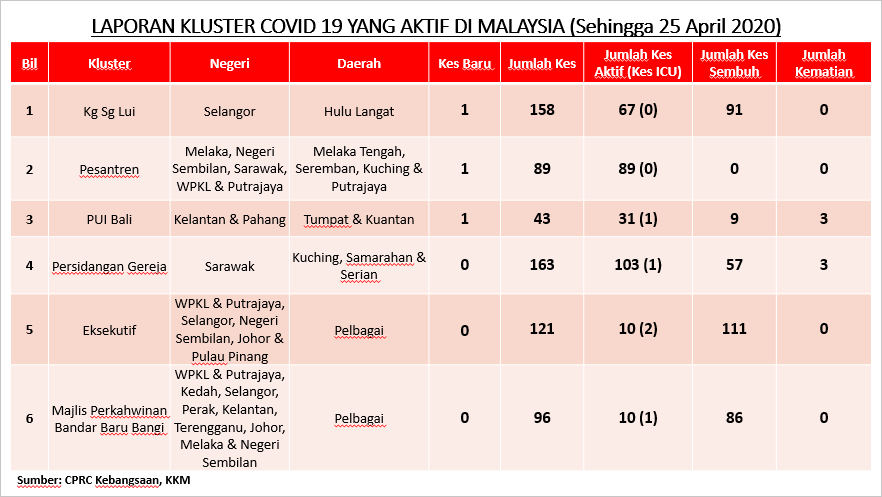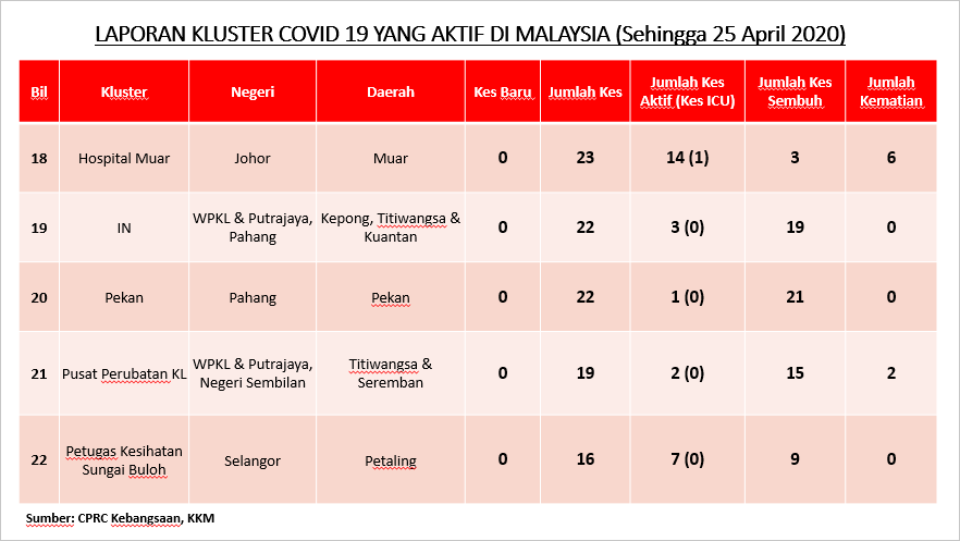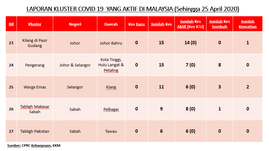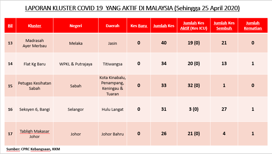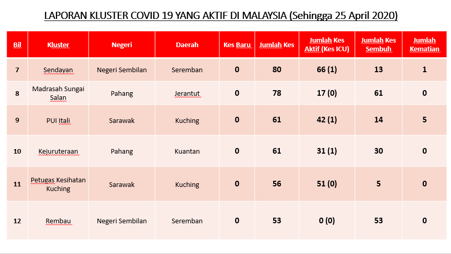 Laporan Kluster COVID-19 Di Malaysia 25/04/2020 Asrul Siaran Media 25 April 2020 Jumlah paparan: 933 Rating: ( 0 Rating ) Sila beri kadar Undi 1 Undi 2 Undi 3 Undi 4 Undi 5 Facebook Twitter Seterusnya Seterusnya