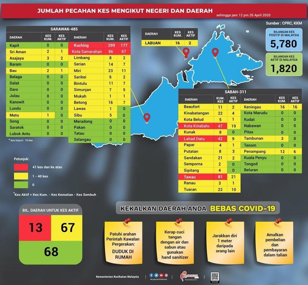 Statistik Pecahan Kes COVID-19 Mengikut Negeri & Daerah Di Malaysia 26/04/2020 1200 PM Aiman Siaran Media 26 April 2020 Jumlah paparan: 642 Rating: ( 1 Rating ) Kadar pengguna: 4 / 5 Sila beri kadar Undi 1 Undi 2 Undi 3 Undi 4 Undi 5 Lihat / Muat Turun JPG 1 Lihat / Muat Turun JPG 2 Facebook Twitter Seterusnya Seterusnya