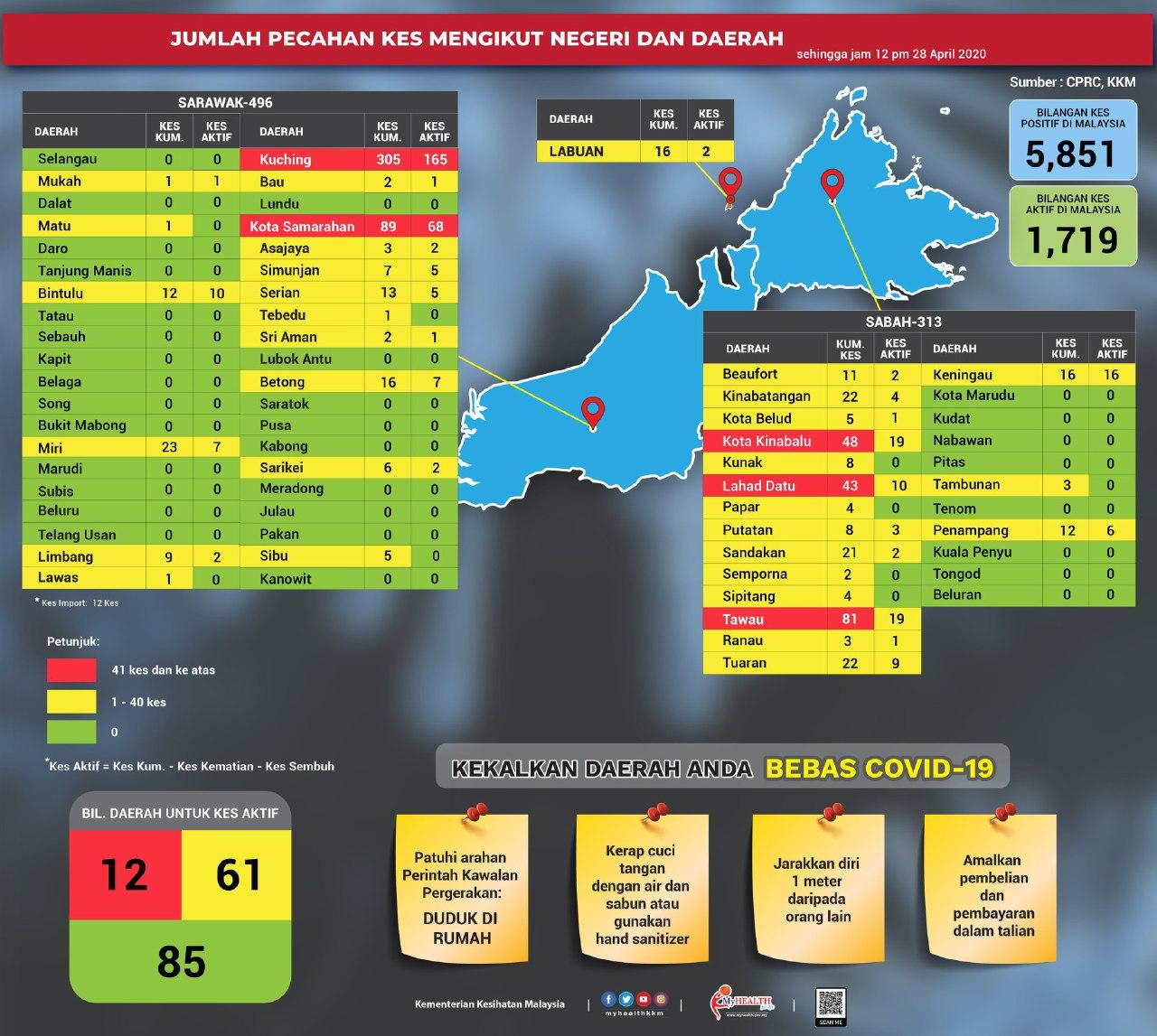 Statistik Pecahan Kes COVID-19 Mengikut Negeri & Daerah Di Malaysia 28/04/2020 1200 PM Asrul Siaran Media 28 April 2020 Jumlah paparan: 784 Rating: ( 0 Rating ) Sila beri kadar Undi 1 Undi 2 Undi 3 Undi 4 Undi 5 Lihat / Muat Turun JPG 1 Lihat / Muat Turun JPG 2 Facebook Twitter Seterusnya Seterusnya