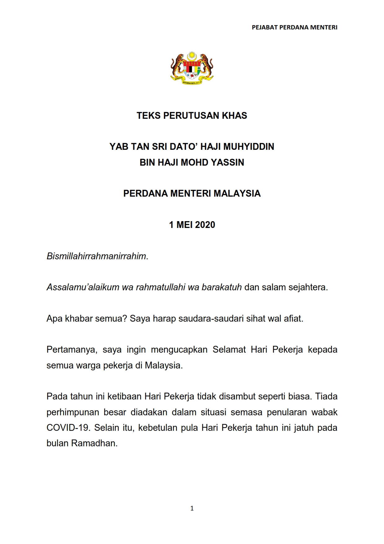 Perutusan KHAS Perdana Menteri Malaysia 01/05/2020 Asrul Siaran Media 01 Mei 2020 Jumlah paparan: 983 Rating: ( 0 Rating ) Sila beri kadar Undi 1 Undi 2 Undi 3 Undi 4 Undi 5 Lihat / Muat Turun PDF Facebook Twitter Seterusnya Seterusnya