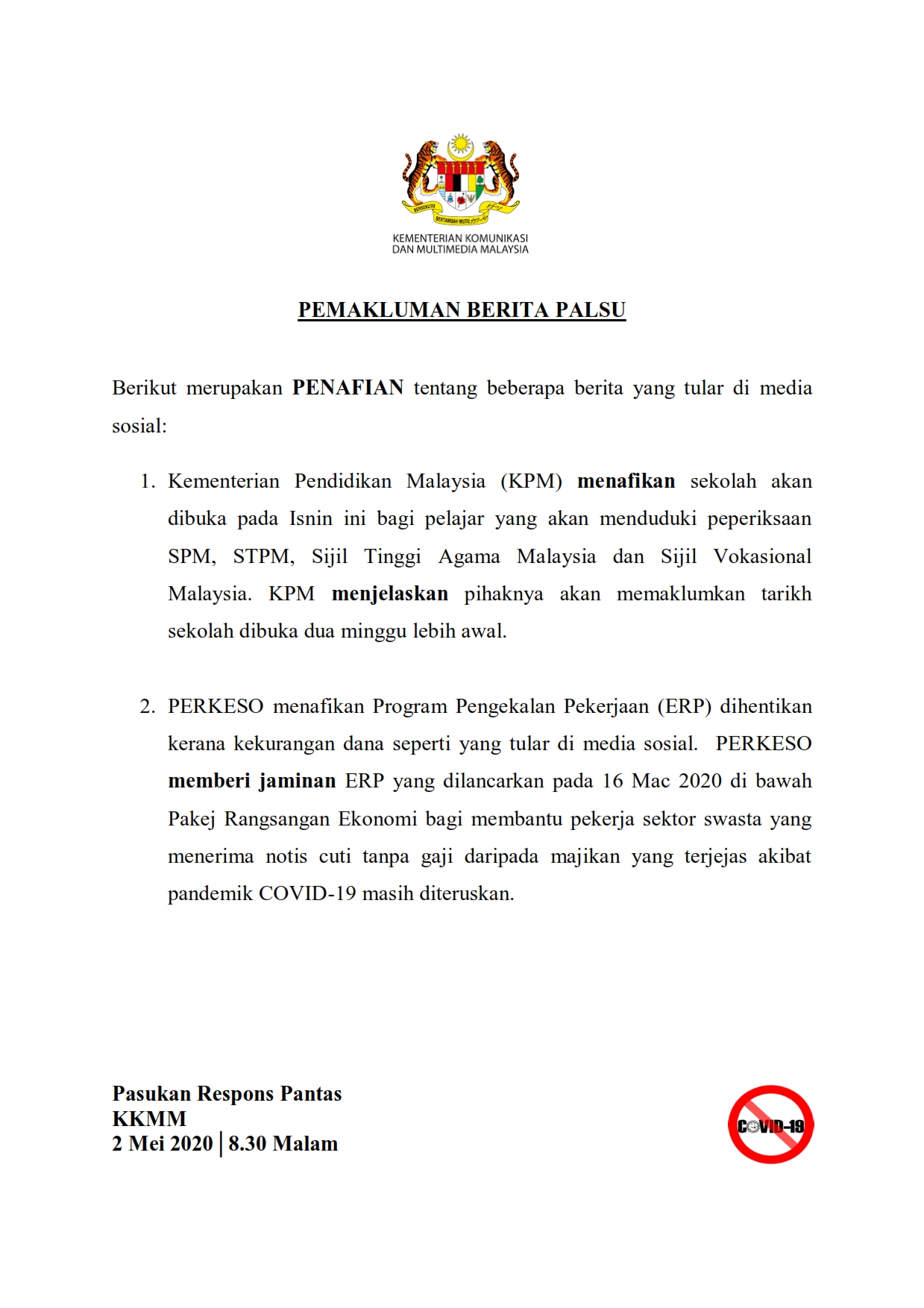 Pemakluman Berita Palsu SKMM 02/05/2020 0830 PM Asrul Siaran Media 02 Mei 2020 Jumlah paparan: 1086 Rating: ( 0 Rating ) Sila beri kadar Undi 1 Undi 2 Undi 3 Undi 4 Undi 5 Lihat / Muat Turun JPG Facebook Twitter Seterusnya Seterusnya