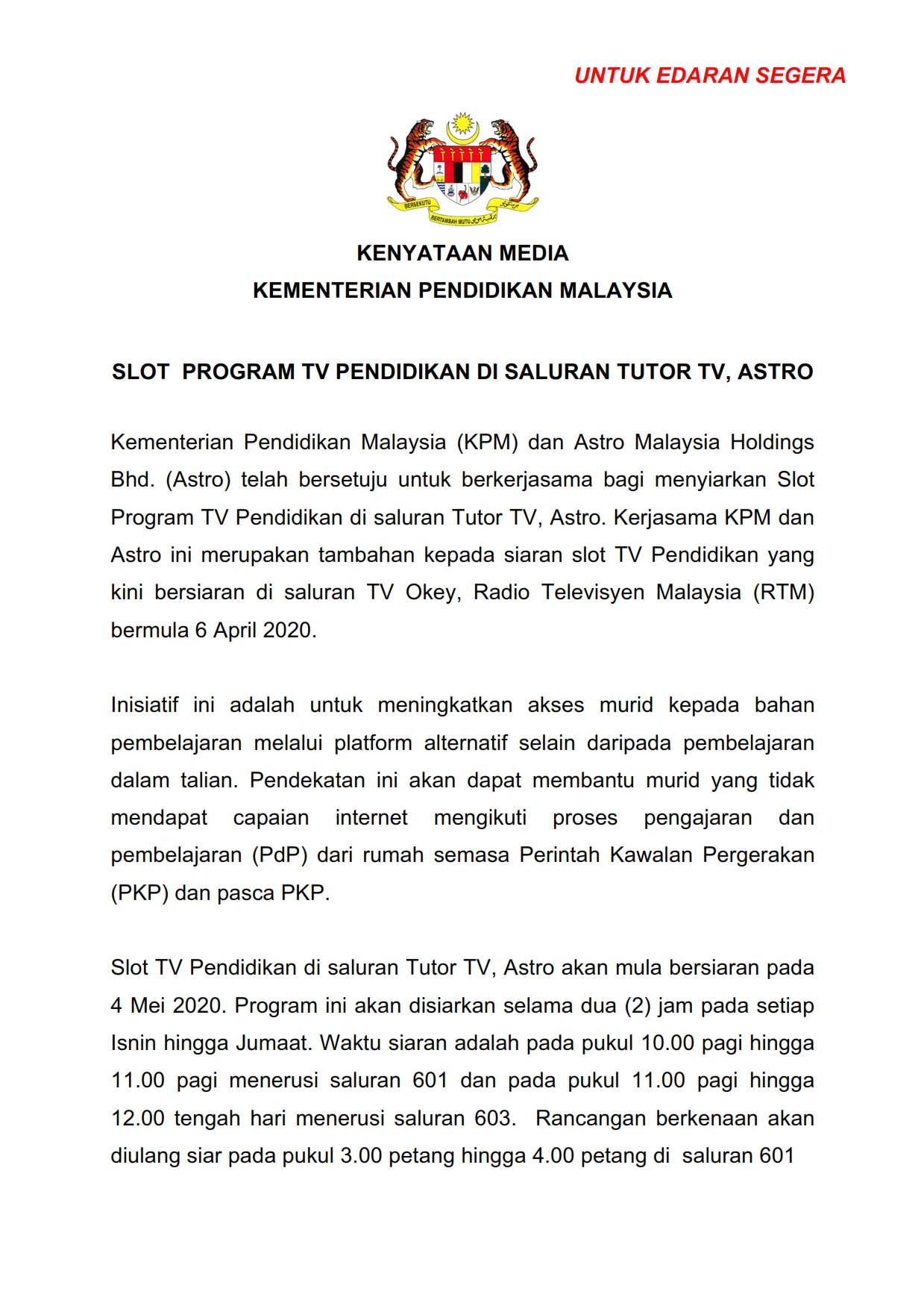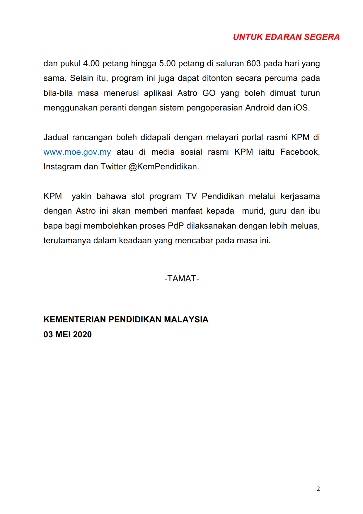 Kenyataan Media Kementerian Pendidikan Malaysia 03/05/2020 Aiman Siaran Media 03 Mei 2020 Jumlah paparan: 1371 Rating: ( 0 Rating ) Sila beri kadar Undi 1 Undi 2 Undi 3 Undi 4 Undi 5 Lihat / Muat Turun JPG Facebook Twitter Seterusnya Seterusnya