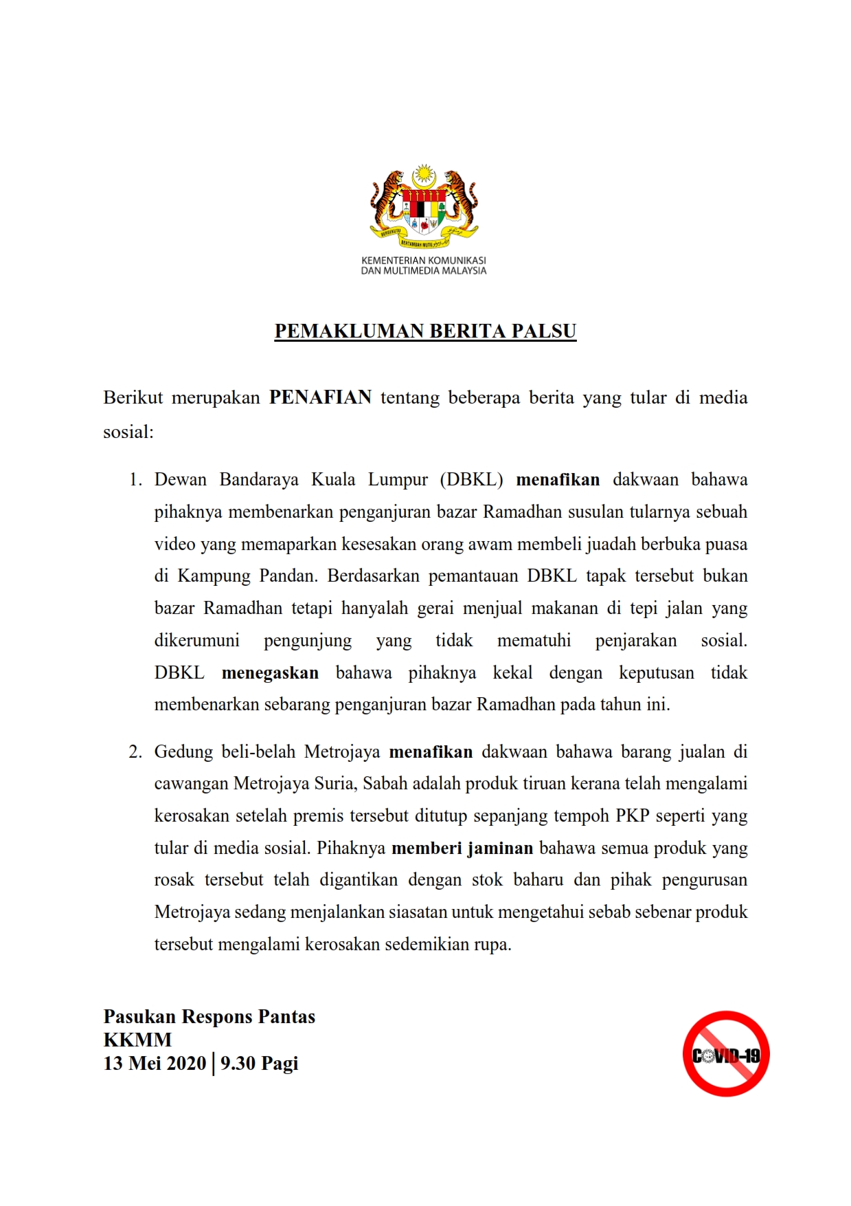 Pemakluman Berita Palsu SKMM 13/05/2020 1000 AM Aiman Siaran Media 13 Mei 2020 Jumlah paparan: 1117 Rating: ( 0 Rating ) Sila beri kadar Undi 1 Undi 2 Undi 3 Undi 4 Undi 5 Lihat / Muat Turun PDF Facebook Twitter Seterusnya Seterusnya