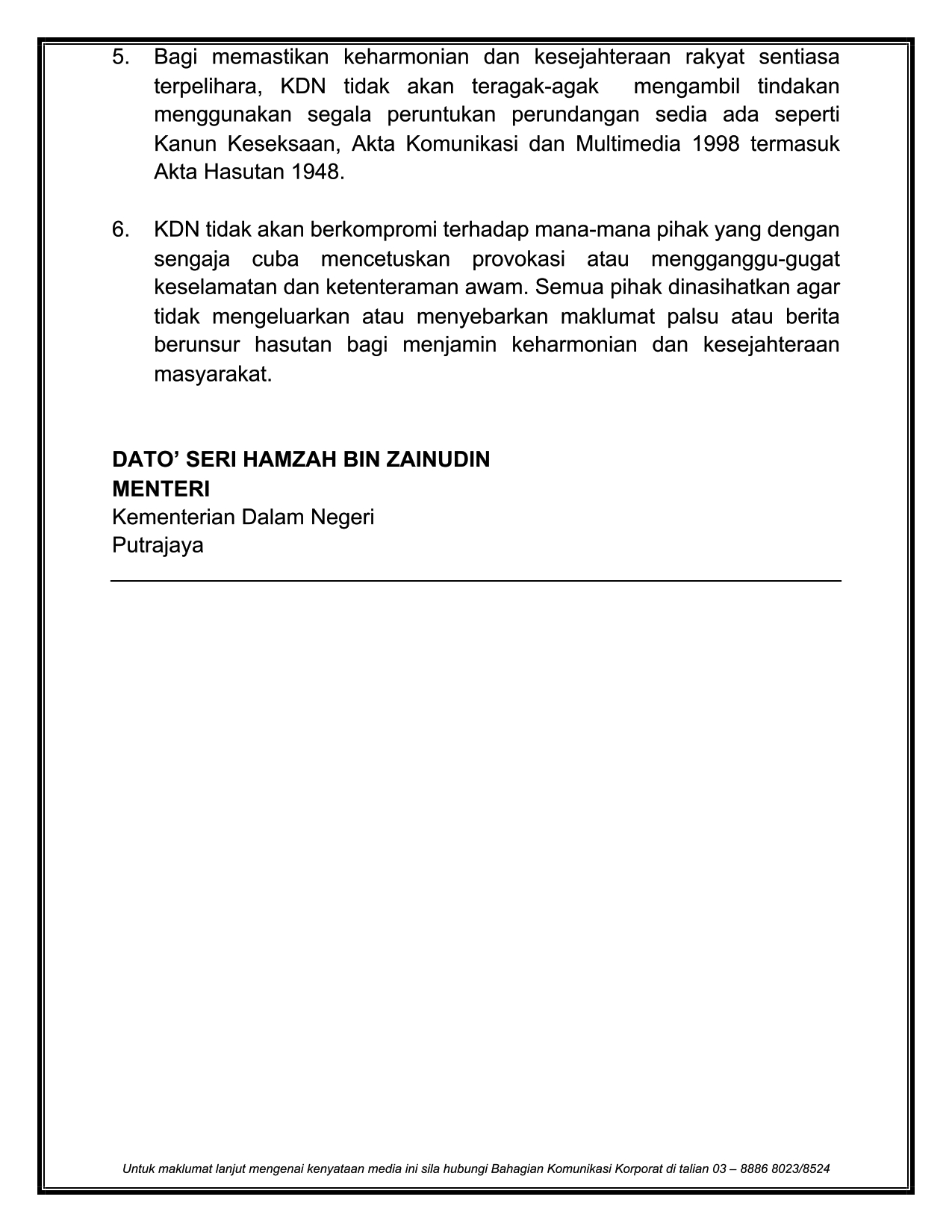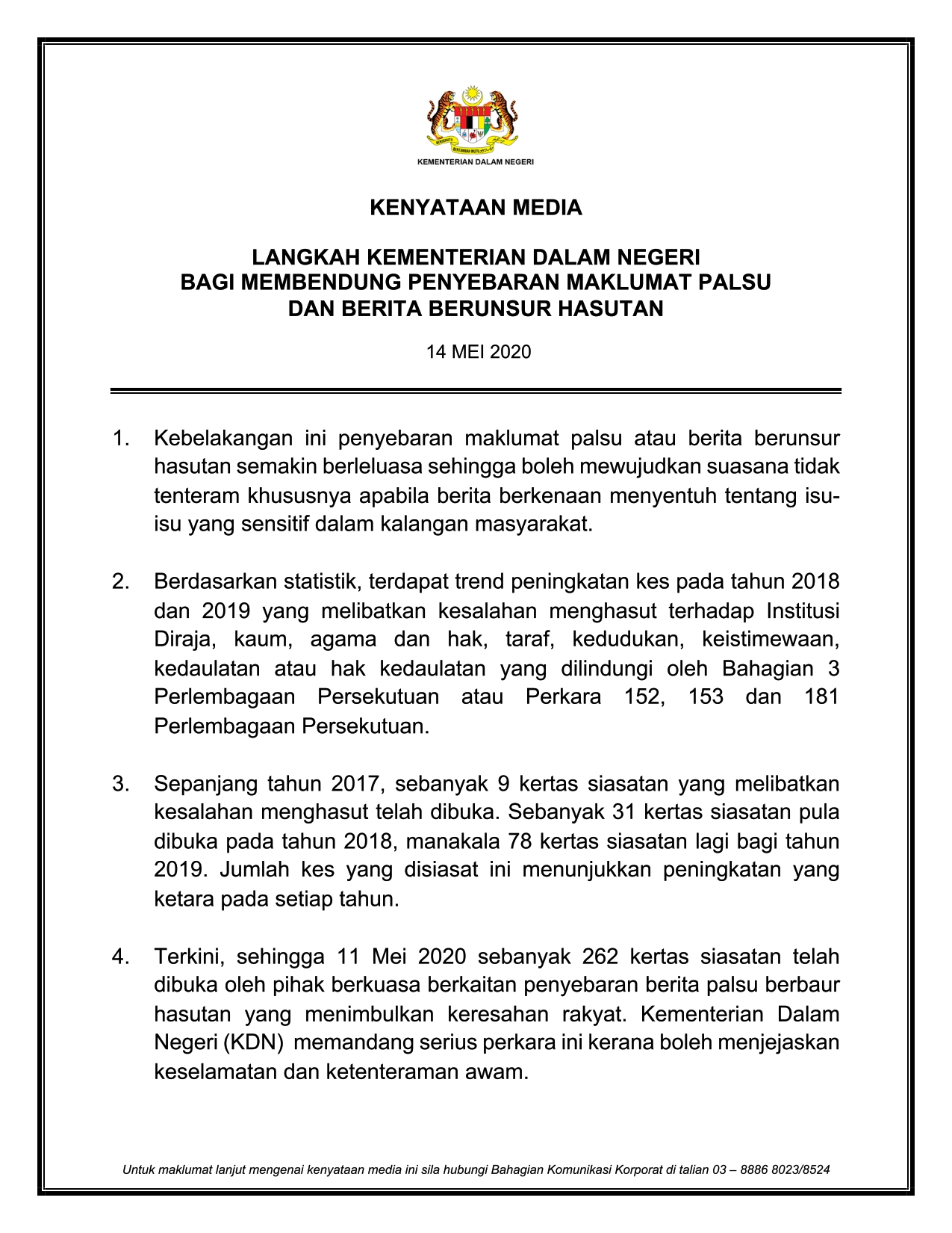 Siaran Akhbar Kementerian Dalam Negeri 14/05/2020 Aiman Siaran Media 14 Mei 2020 Jumlah paparan: 1064 Rating: ( 0 Rating ) Sila beri kadar Undi 1 Undi 2 Undi 3 Undi 4 Undi 5 Lihat / Muat Turun PDF Facebook Twitter Seterusnya Seterusnya