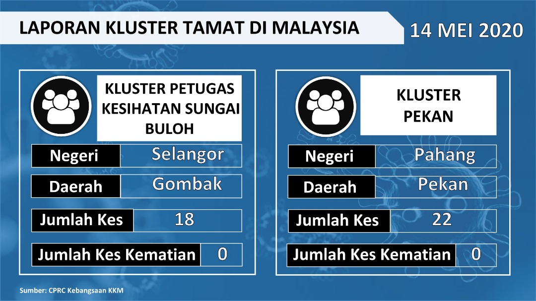 Laporan Kluster COVID-19 Tamat Di Malaysia 14/05/2020 Asrul Siaran Media 14 Mei 2020 Jumlah paparan: 774 Rating: ( 0 Rating ) Sila beri kadar Undi 1 Undi 2 Undi 3 Undi 4 Undi 5 Facebook Twitter Seterusnya Seterusnya