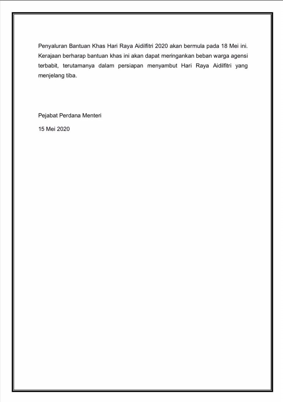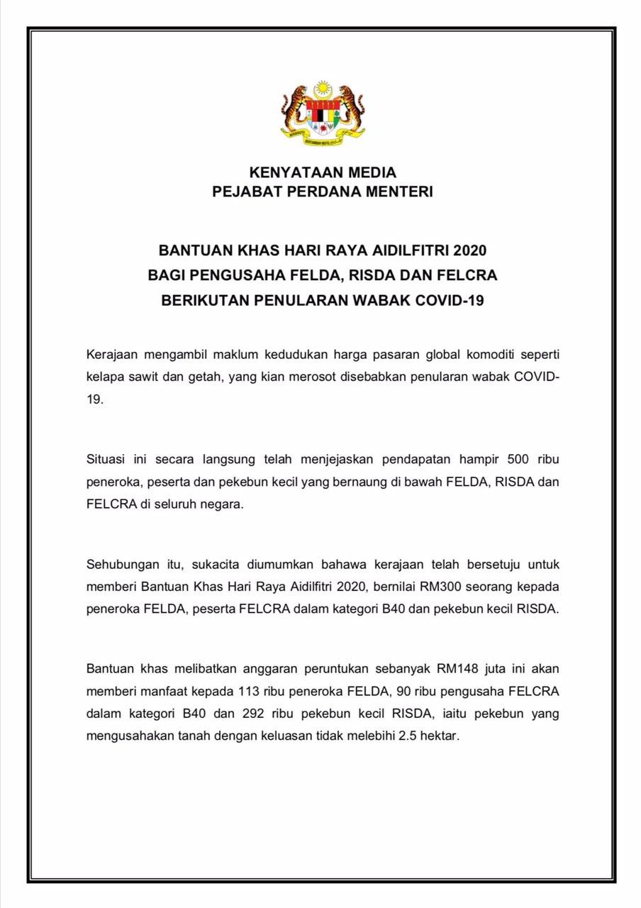 Kenyataan Media JPM - Bantuan Khas Hari Raya Aidilfitri 2020 Bagi FELDA , RISDA & FELCRA Asrul Siaran Media 15 Mei 2020 Jumlah paparan: 997 Rating: ( 0 Rating ) Sila beri kadar Undi 1 Undi 2 Undi 3 Undi 4 Undi 5 Lihat / Muat Turun JPG 1 Lihat / Muat Turun JPG 2 Facebook Twitter Seterusnya Seterusnya