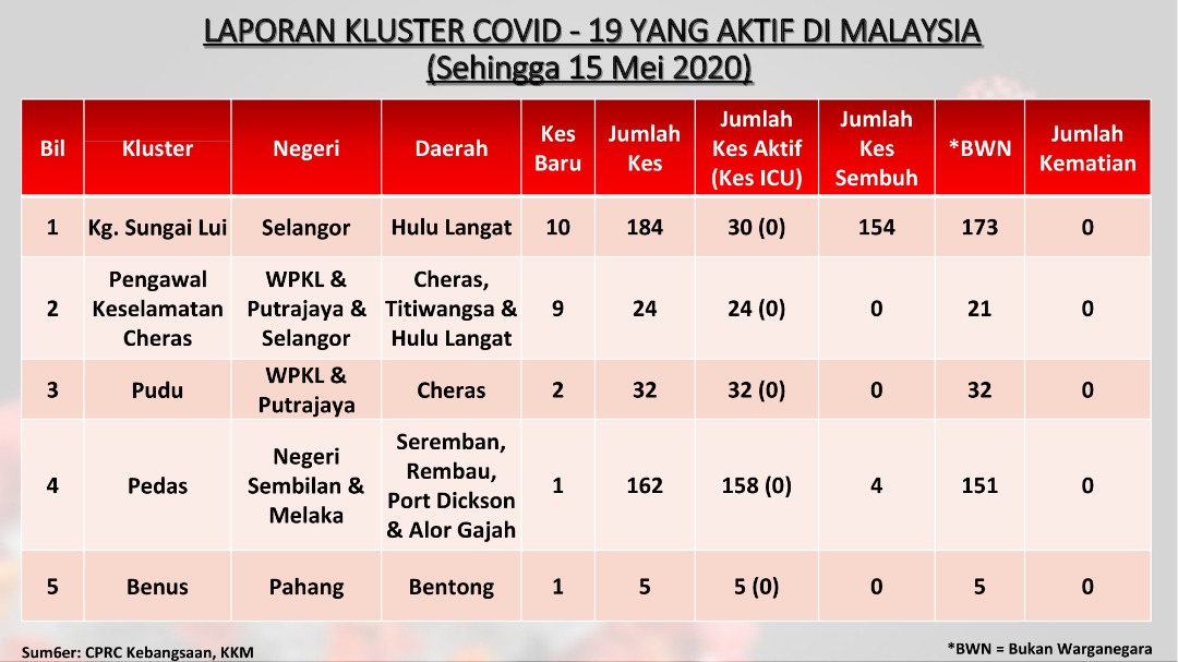 Laporan Kluster COVID-19 Aktif Di Malaysia 15/05/2020 Asrul Siaran Media 15 Mei 2020 Jumlah paparan: 982 Rating: ( 0 Rating ) Sila beri kadar Undi 1 Undi 2 Undi 3 Undi 4 Undi 5 Facebook Twitter Seterusnya Seterusnya