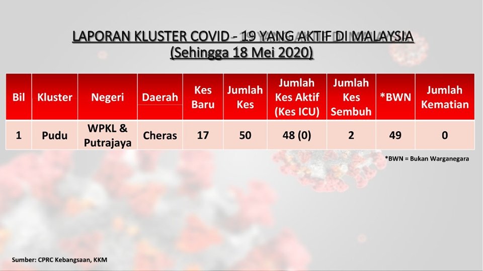 Laporan Kluster COVID-19 Aktif Di Malaysia 18/05/2020 Asrul Siaran Media 18 Mei 2020 Jumlah paparan: 1032 Rating: ( 0 Rating ) Sila beri kadar Undi 1 Undi 2 Undi 3 Undi 4 Undi 5 Facebook Twitter Seterusnya Seterusnya