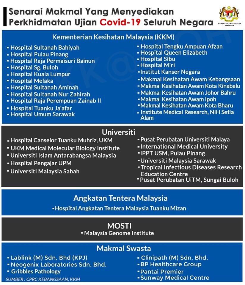 Senarai Makmal Yang Menyediakan Perkhidmatan Ujian COVID-19 Seluruh Negara 20/05/2020 Aiman Siaran Media 20 Mei 2020 Jumlah paparan: 1236 Rating: ( 0 Rating ) Sila beri kadar Undi 1 Undi 2 Undi 3 Undi 4 Undi 5 Lihat / Muat Turun JPG Facebook Twitter Seterusnya Seterusnya