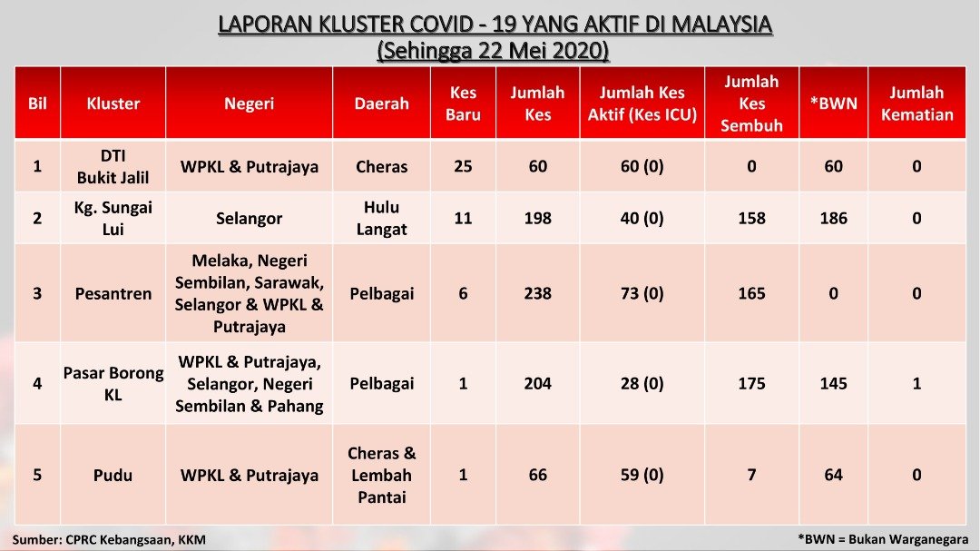 Laporan Kluster COVID-19 Aktif Di Malaysia 22/05/2020 Aiman Siaran Media 22 Mei 2020 Jumlah paparan: 987 Rating: ( 0 Rating ) Sila beri kadar Undi 1 Undi 2 Undi 3 Undi 4 Undi 5 Facebook Twitter Seterusnya Seterusnya