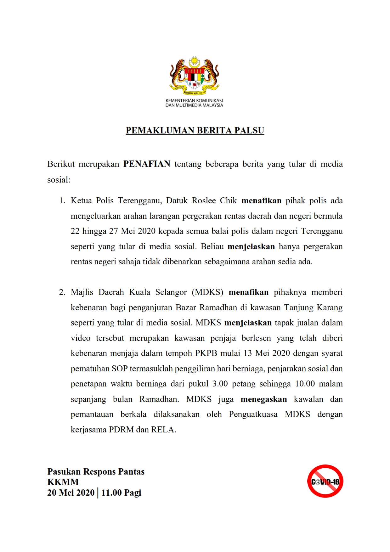 Pemakluman Berita Palsu SKMM 20/05/2020 1100 AM Asrul Siaran Media 20 Mei 2020 Jumlah paparan: 830 Rating: ( 0 Rating ) Sila beri kadar Undi 1 Undi 2 Undi 3 Undi 4 Undi 5 Lihat / Muat Turun PDF Facebook Twitter Seterusnya Seterusnya