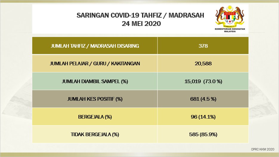 Laporan Saringan COVID-19 Di Madrasah/Tahfiz , Pasar & Pusat Jagaan Warga Emas 24/05/2020 Asrul Siaran Media 24 Mei 2020 Jumlah paparan: 771 Rating: ( 0 Rating ) Sila beri kadar Undi 1 Undi 2 Undi 3 Undi 4 Undi 5 Facebook Twitter Seterusnya Seterusnya