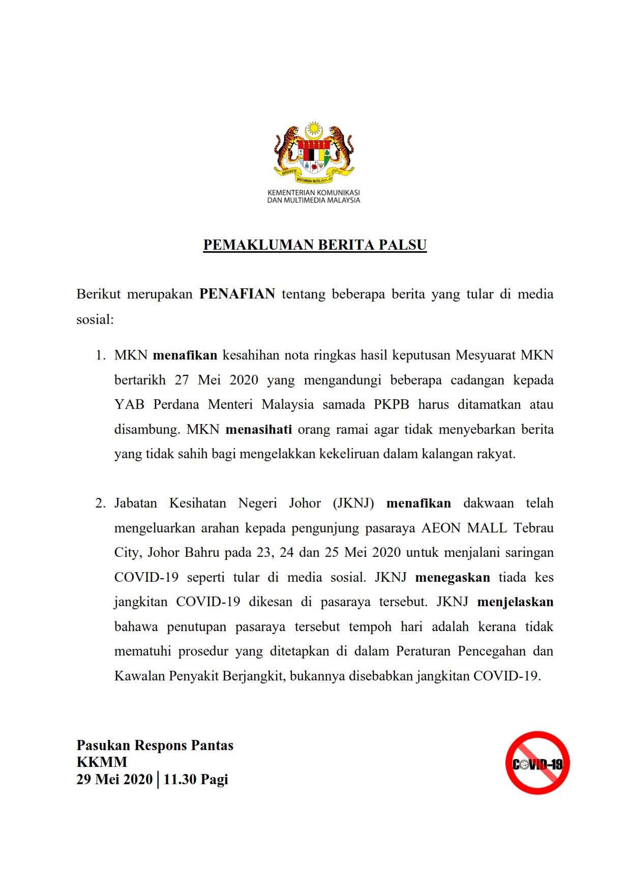 Pemakluman Berita Palsu SKMM 29/05/2020 1130 AM Aiman Siaran Media 29 Mei 2020 Jumlah paparan: 1195 Rating: ( 0 Rating ) Sila beri kadar Undi 1 Undi 2 Undi 3 Undi 4 Undi 5 Lihat / Muat Turun PDF Facebook Twitter Seterusnya Seterusnya