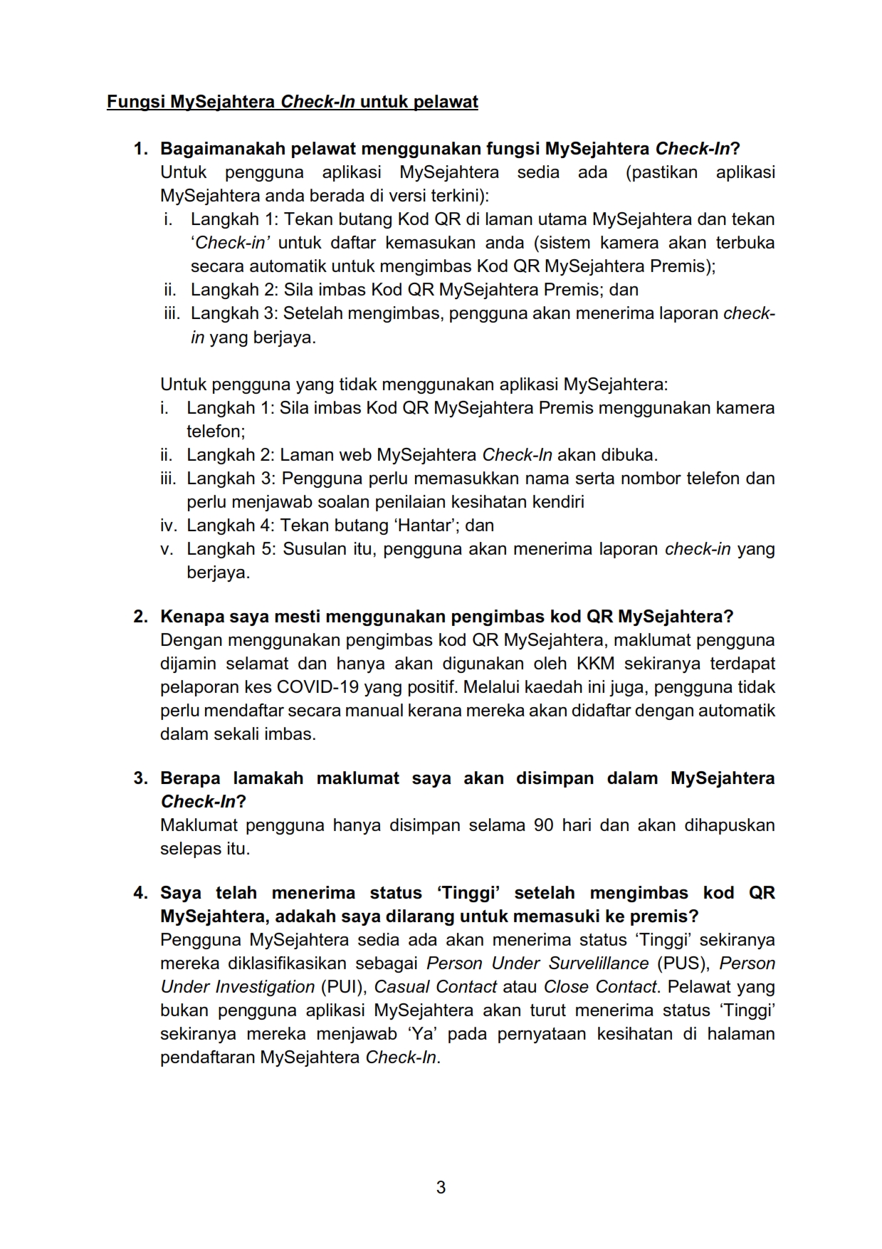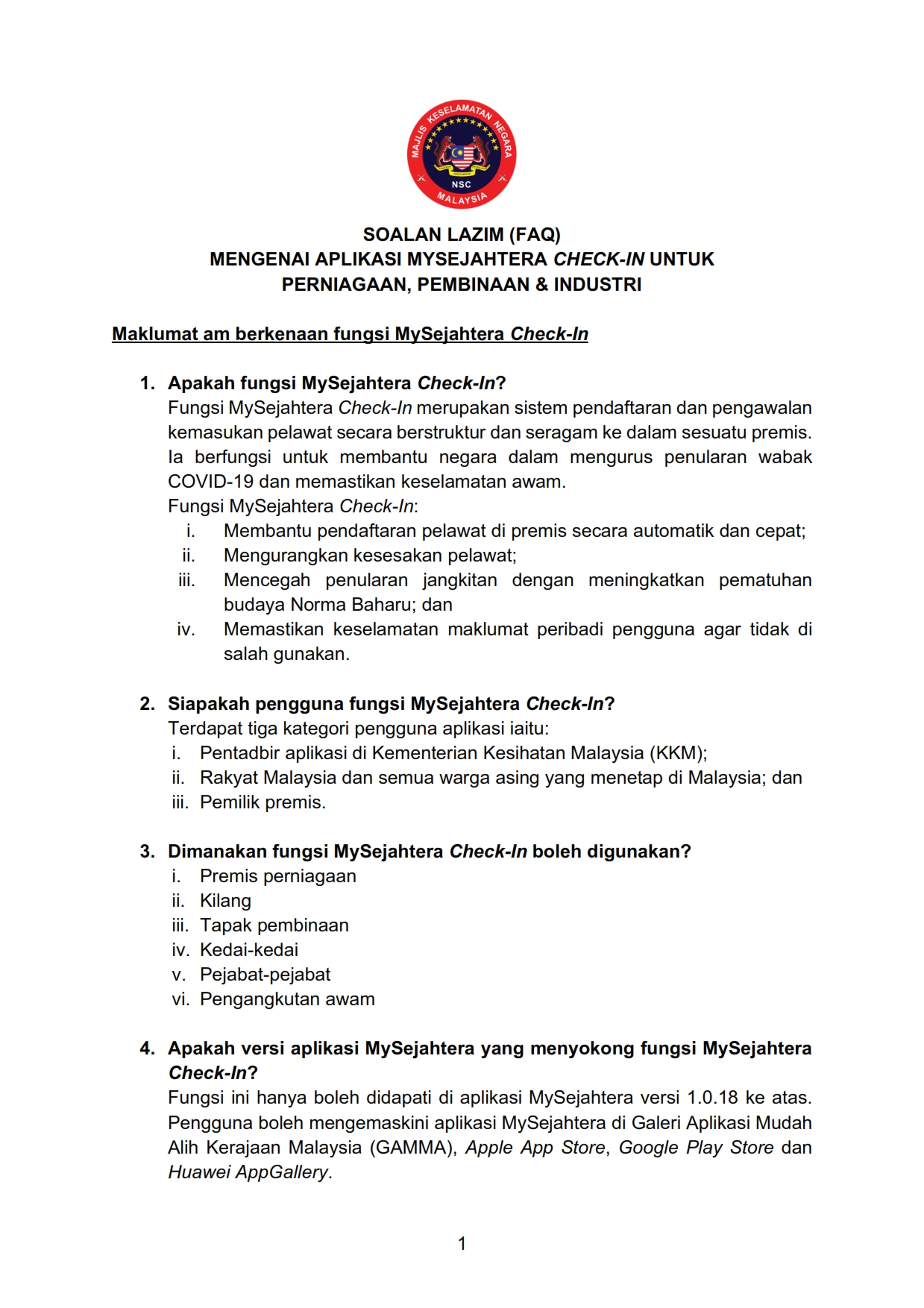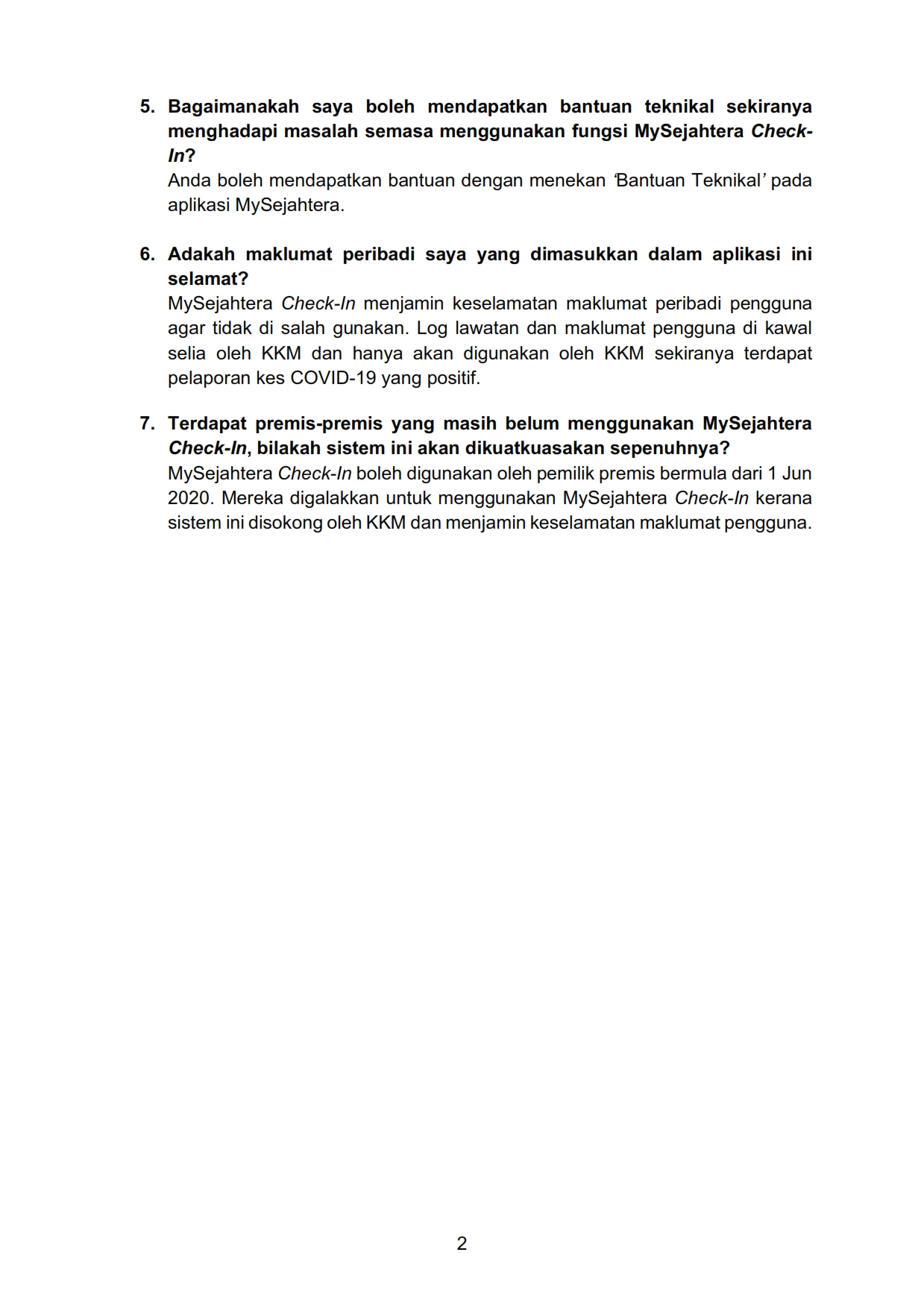 Soalan Lazim FAQ - Mengenai Applikasi MySejahtera MKN 02/06/2020 Aiman FAQ 02 Jun 2020 Jumlah paparan: 4502 Rating: ( 2 Ratings ) Kadar pengguna: 5 / 5 Sila beri kadar Undi 1 Undi 2 Undi 3 Undi 4 Undi 5 /bencana2/images/ndcc/documents/covid19/faq202004/SIARAN_MEDIA_KKM_20200602_01.pdf Facebook Twitter Seterusnya Seterusnya