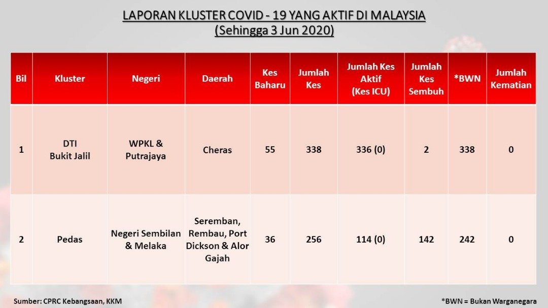 Laporan Kluster COVID-19 Aktif Di Malaysia 03/06/2020 Aiman Siaran Media 03 Jun 2020 Jumlah paparan: 1001 Rating: ( 0 Rating ) Sila beri kadar Undi 1 Undi 2 Undi 3 Undi 4 Undi 5 /images/ndcc/documents/covid19/siaranmedia202006/SIARAN_MEDIA_KKM_20200603_06.jpg Facebook Twitter Seterusnya Seterusnya