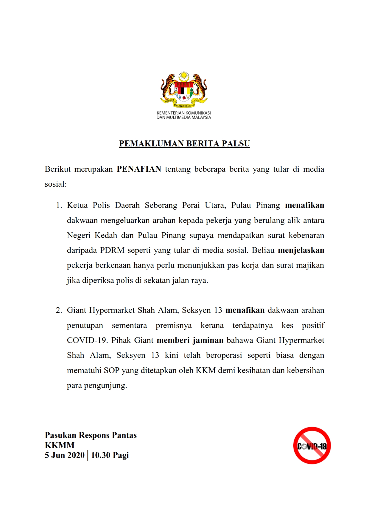 Pemakluman Berita Palsu SKMM 05/06/2020 1030 AM Asrul Siaran Media 05 Jun 2020 Jumlah paparan: 1048 Rating: ( 0 Rating ) Sila beri kadar Undi 1 Undi 2 Undi 3 Undi 4 Undi 5 Lihat / Muat Turun PDF Facebook Twitter Seterusnya Seterusnya