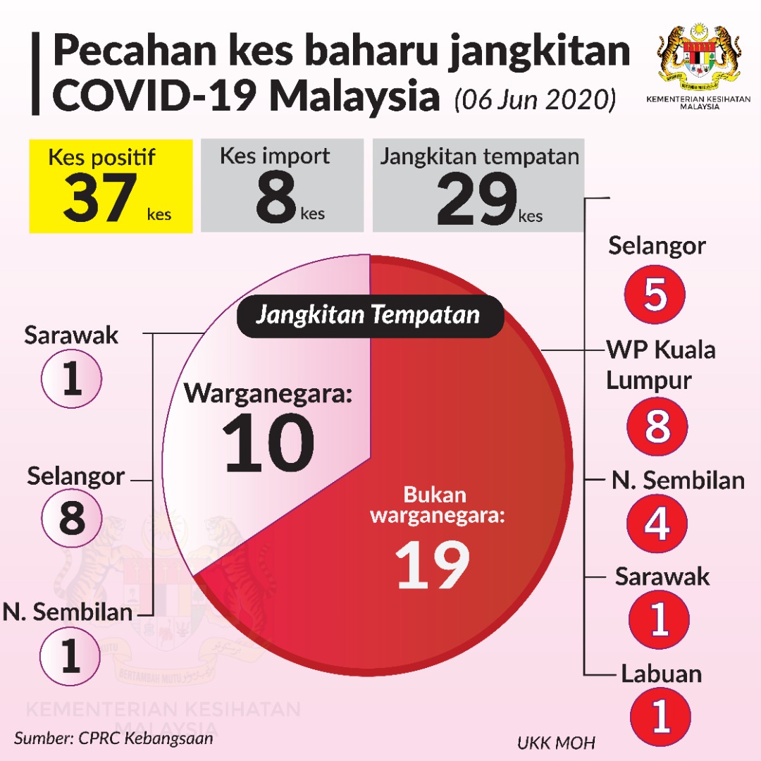 Statistik Pecahan Kes Baharu Jangkitan COVID-19 Malaysia 06/06/2020 Asrul Siaran Media 06 Jun 2020 Jumlah paparan: 711 Rating: ( 0 Rating ) Sila beri kadar Undi 1 Undi 2 Undi 3 Undi 4 Undi 5 Lihat / Muat Turun JPG Facebook Twitter Seterusnya Seterusnya