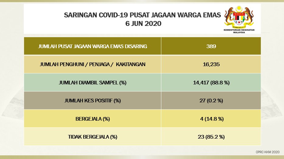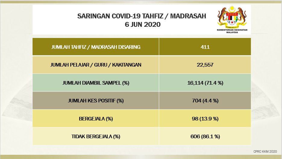 Laporan Saringan COVID-19 Di Madrasah/Tahfiz , Pasar & Pusat Jagaan Warga Emas 06/06/2020 Asrul Siaran Media 06 Jun 2020 Jumlah paparan: 850 Rating: ( 0 Rating ) Sila beri kadar Undi 1 Undi 2 Undi 3 Undi 4 Undi 5 Facebook Twitter Seterusnya Seterusnya