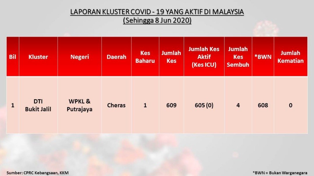 Laporan Kluster COVID-19 Aktif Di Malaysia 08/06/2020 Asrul Siaran Media 08 Jun 2020 Jumlah paparan: 1054 Rating: ( 0 Rating ) Sila beri kadar Undi 1 Undi 2 Undi 3 Undi 4 Undi 5 Lihat / Muat Turun JPG Facebook Twitter Seterusnya Seterusnya