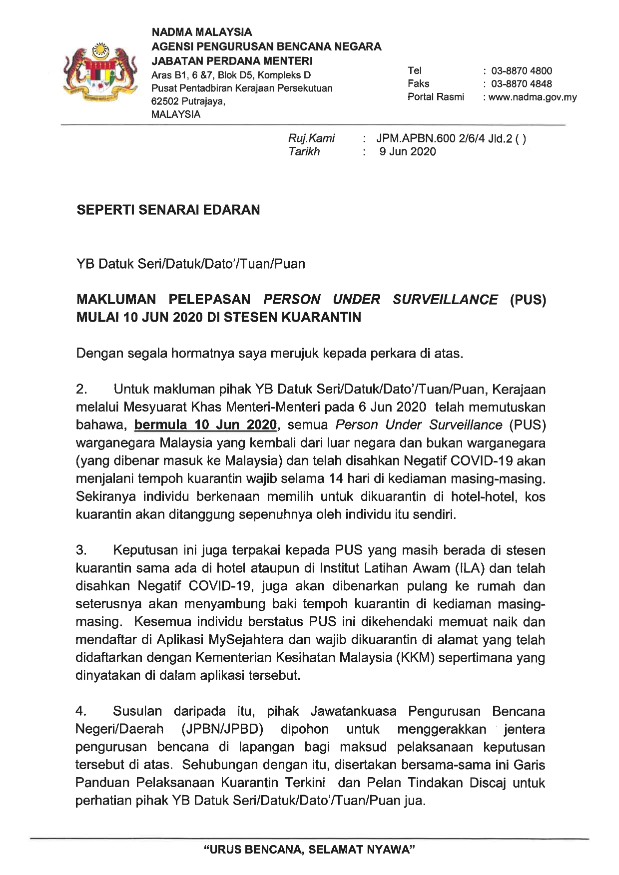 NADMA: Makluman Pelepasan PUS Mulai 10 Jun 2020 Di Stesen Kuarantin Aiman Siaran Media 10 Jun 2020 Jumlah paparan: 1236 Rating: ( 0 Rating ) Sila beri kadar Undi 1 Undi 2 Undi 3 Undi 4 Undi 5 Lihat / Muat Turun PDF Facebook Twitter Seterusnya Seterusnya