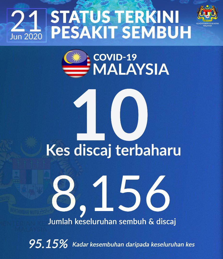 COVID-19 - Jumlah Keseluruhan Kes Discaj 21/06/2020 Asrul Siaran Media 21 Jun 2020 Jumlah paparan: 884 Rating: ( 0 Rating ) Sila beri kadar Undi 1 Undi 2 Undi 3 Undi 4 Undi 5 Facebook Twitter Seterusnya Seterusnya