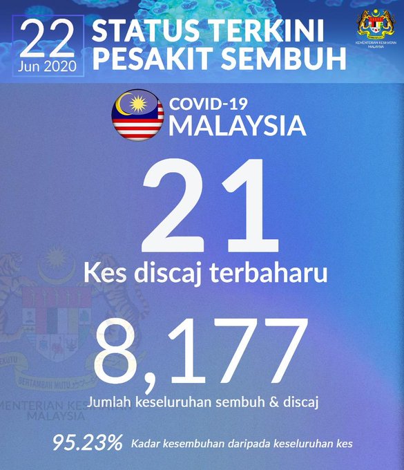 COVID-19 - Jumlah Keseluruhan Kes Discaj 22/06/2020 Asrul Siaran Media 22 Jun 2020 Jumlah paparan: 806 Rating: ( 0 Rating ) Sila beri kadar Undi 1 Undi 2 Undi 3 Undi 4 Undi 5 Facebook Twitter Seterusnya Seterusnya