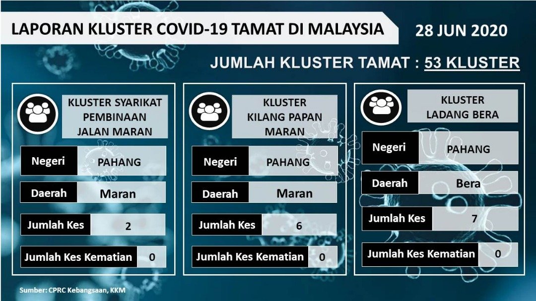 Laporan Kluster COVID-19 Tamat Di Malaysia 28/06/2020 Asrul Siaran Media 28 Jun 2020 Jumlah paparan: 894 Rating: ( 0 Rating ) Sila beri kadar Undi 1 Undi 2 Undi 3 Undi 4 Undi 5 Facebook Twitter Seterusnya Seterusnya