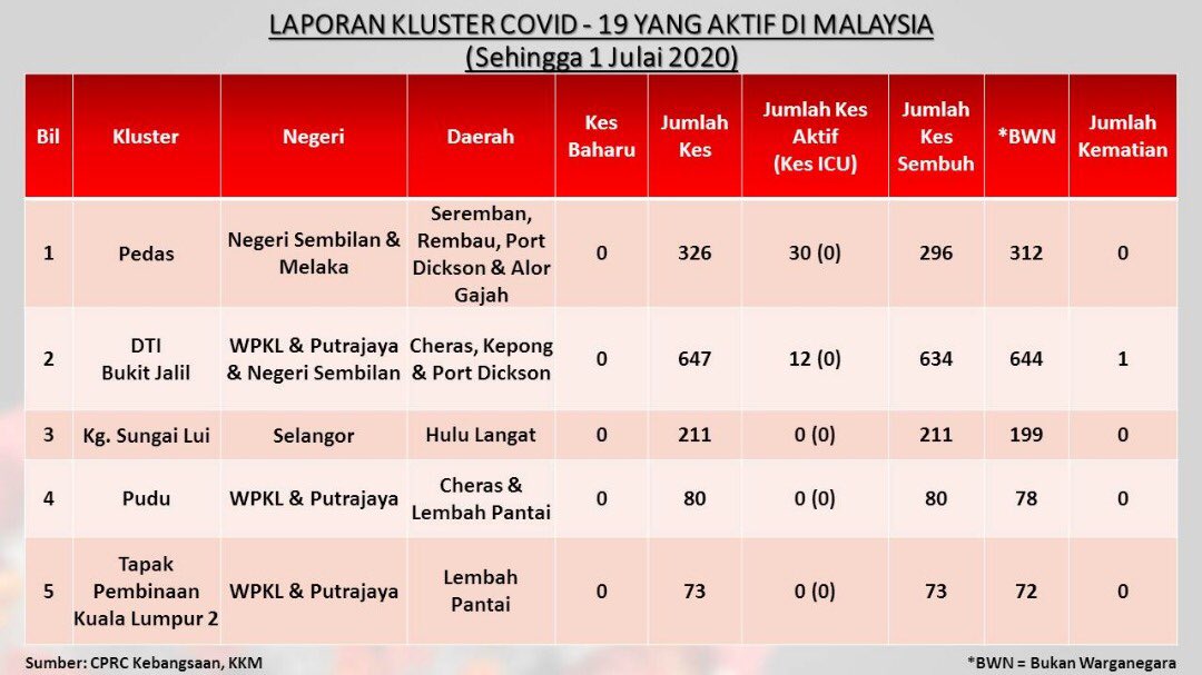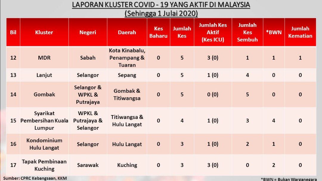 Laporan Kluster COVID-19 Aktif Di Malaysia 01/07/2020 Asrul Siaran Media 01 Julai 2020 Jumlah paparan: 842 Rating: ( 0 Rating ) Sila beri kadar Undi 1 Undi 2 Undi 3 Undi 4 Undi 5 Facebook Twitter Seterusnya Seterusnya