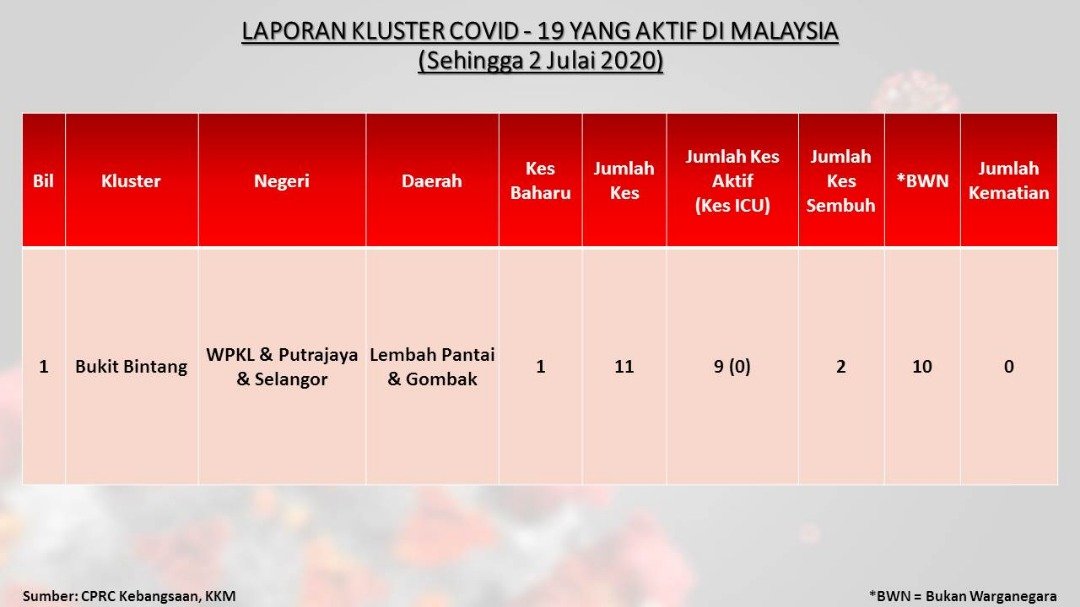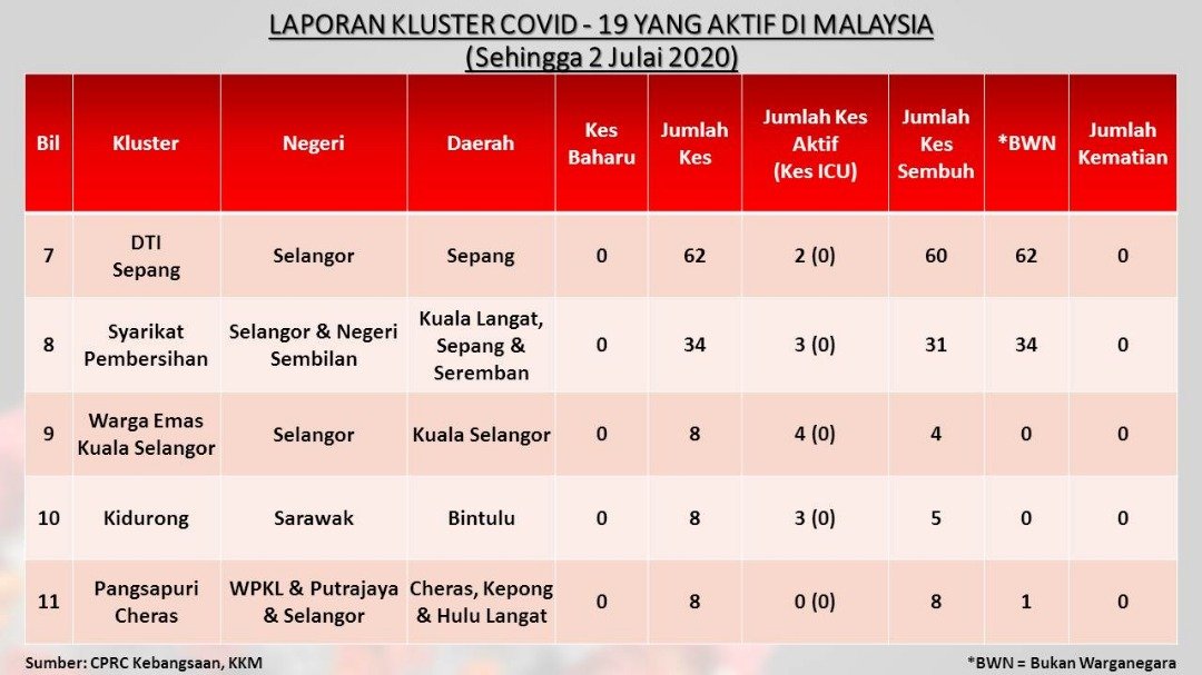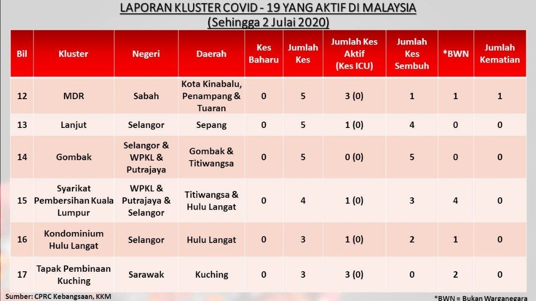 Laporan Kluster COVID-19 Aktif Di Malaysia 02/07/2020 Asrul Siaran Media 02 Julai 2020 Jumlah paparan: 796 Rating: ( 0 Rating ) Sila beri kadar Undi 1 Undi 2 Undi 3 Undi 4 Undi 5 Facebook Twitter Seterusnya Seterusnya