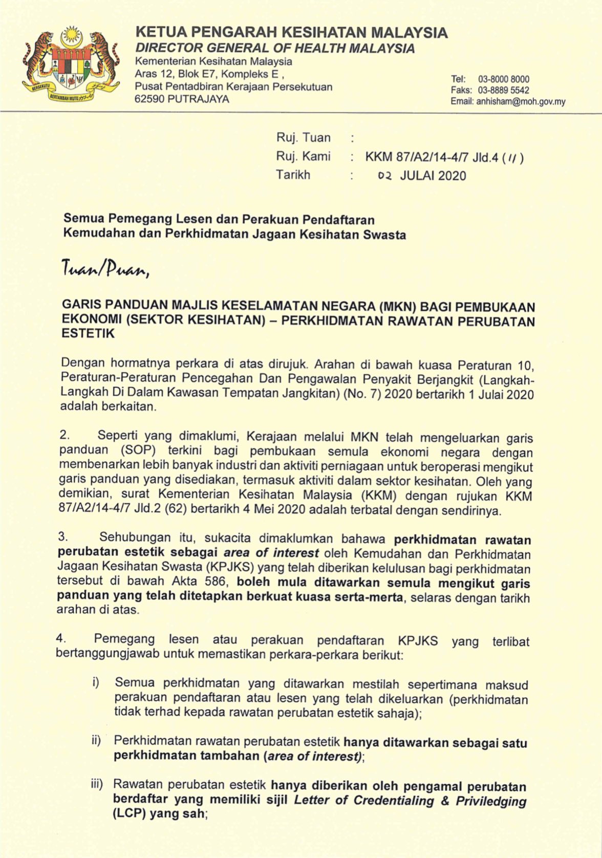 KP KKM - Garis Panduan MKN Bagi Pembukaan Sektor Ekonomi (Kesihatan) - Perkhidmatan Rawatan Perubatan Estetik 02/07/2020 0430 PM Asrul Siaran Media 02 Julai 2020 Jumlah paparan: 1597 Rating: ( 0 Rating ) Sila beri kadar Undi 1 Undi 2 Undi 3 Undi 4 Undi 5 Facebook Twitter Seterusnya Seterusnya