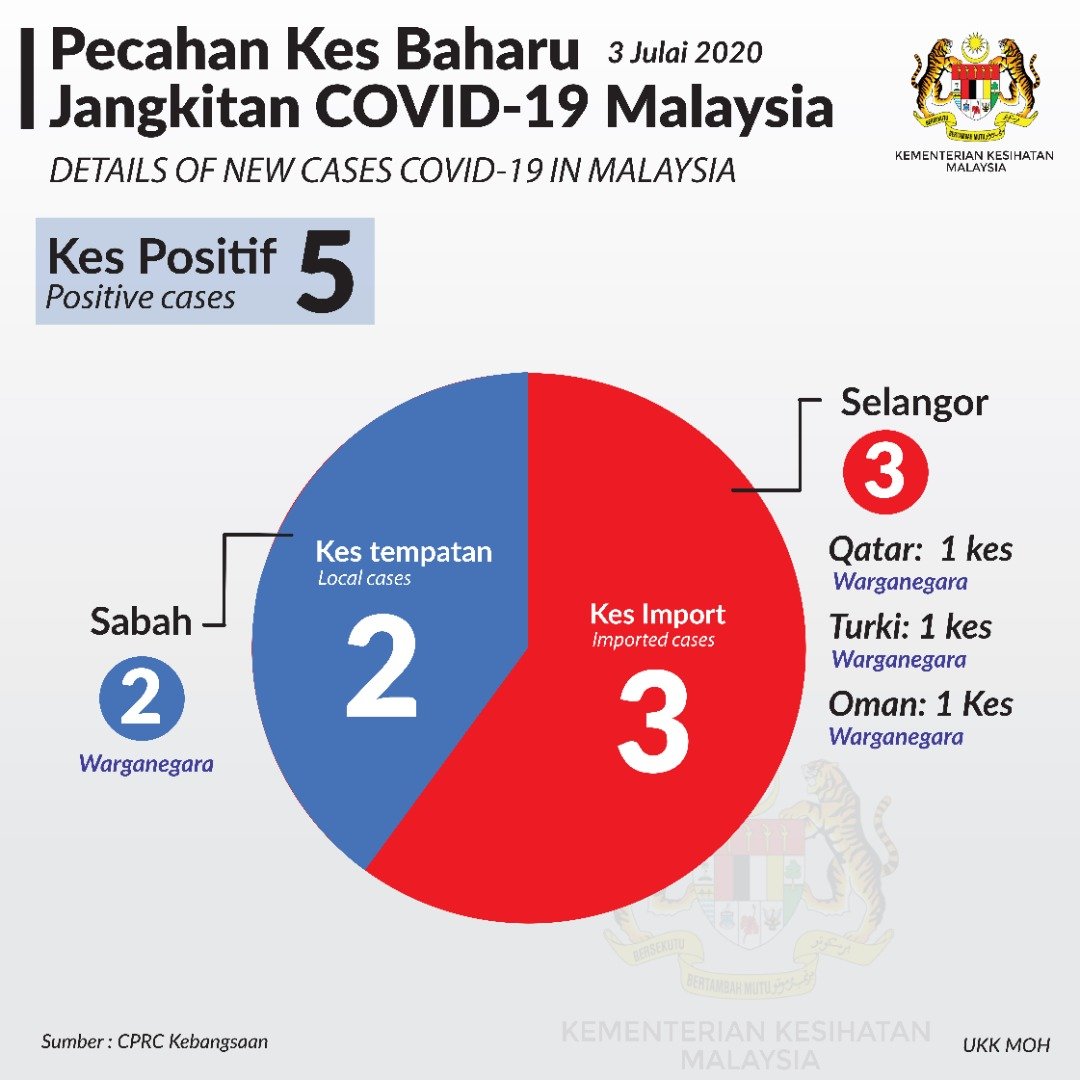 Statistik Pecahan Kes Baharu Jangkitan COVID-19 Malaysia 03/07/2020 Asrul Siaran Media 03 Julai 2020 Jumlah paparan: 578 Rating: ( 0 Rating ) Sila beri kadar Undi 1 Undi 2 Undi 3 Undi 4 Undi 5 Facebook Twitter Seterusnya Seterusnya