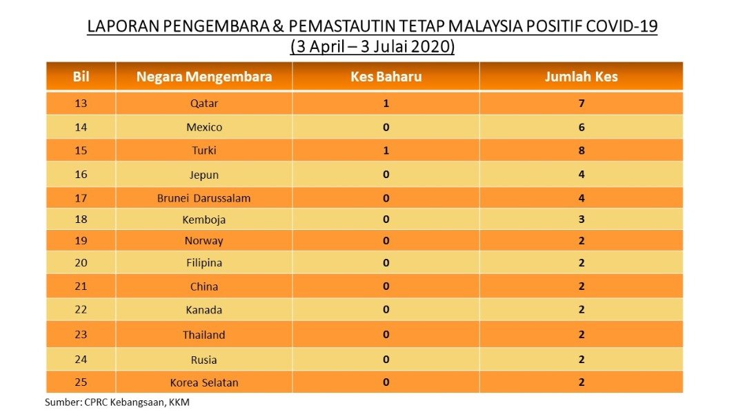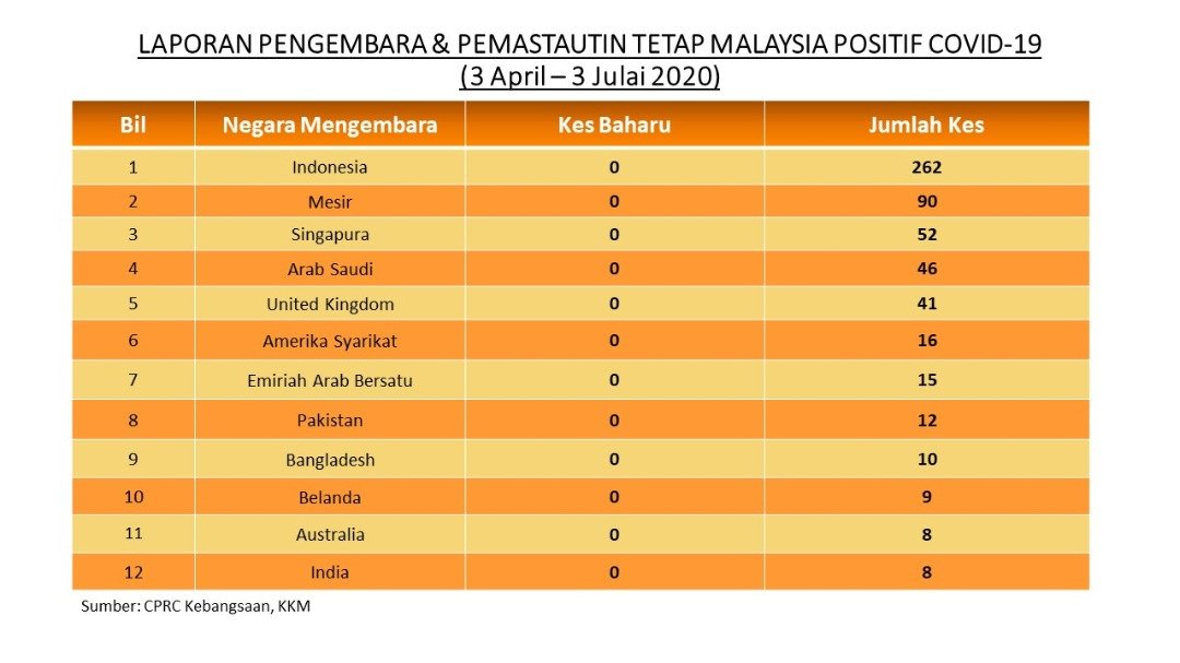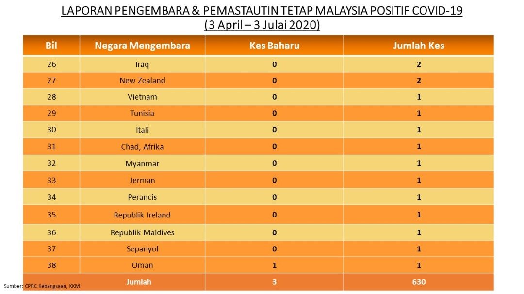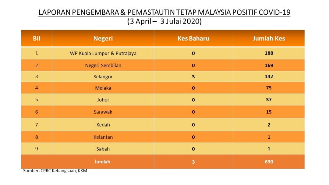Laporan Pengembara & Pemastautin Tetap Malaysia Positif COVID-19 03/07/2020 Asrul Siaran Media 03 Julai 2020 Jumlah paparan: 934 Rating: ( 0 Rating ) Sila beri kadar Undi 1 Undi 2 Undi 3 Undi 4 Undi 5 Facebook Twitter Seterusnya Seterusnya
