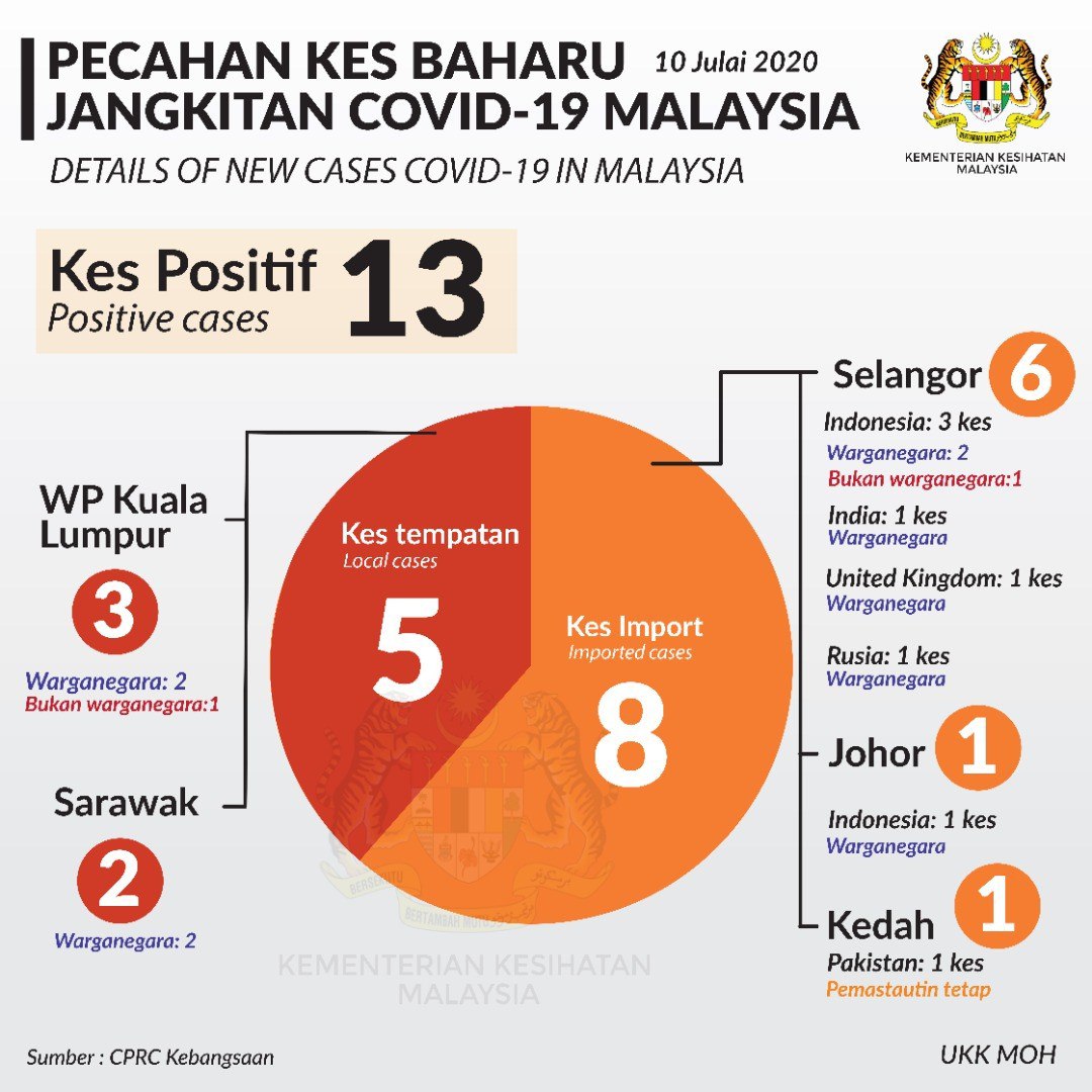 Statistik Pecahan Kes Baharu Jangkitan COVID-19 Malaysia 10/07/2020 Aiman Siaran Media 10 Julai 2020 Jumlah paparan: 882 Rating: ( 0 Rating ) Sila beri kadar Undi 1 Undi 2 Undi 3 Undi 4 Undi 5 Facebook Twitter Seterusnya Seterusnya