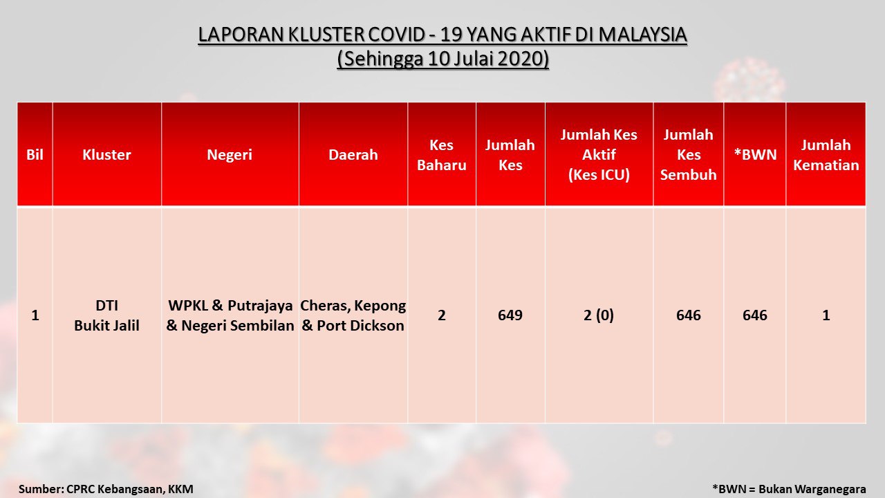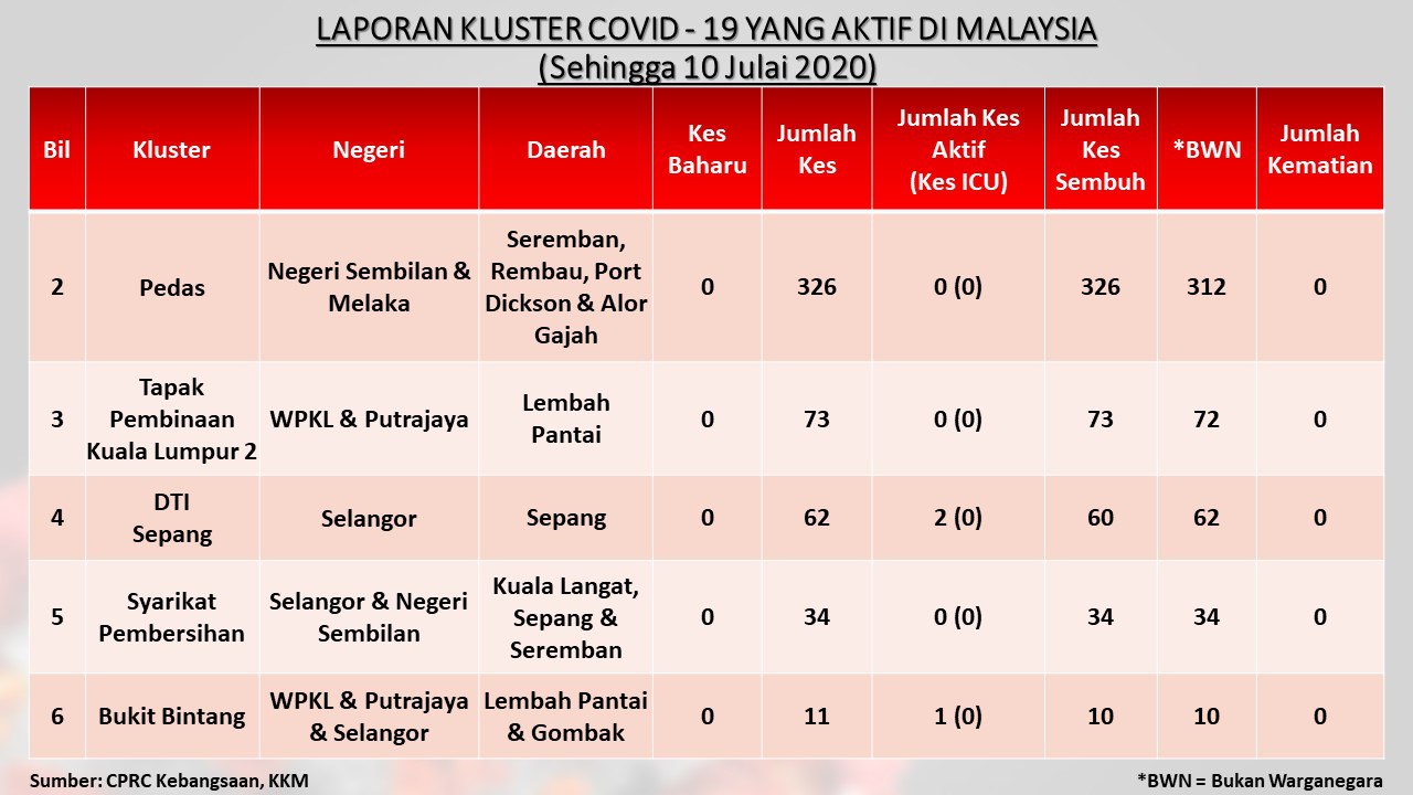 Laporan Kluster COVID-19 Aktif Di Malaysia 10/07/2020 Aiman Siaran Media 10 Julai 2020 Jumlah paparan: 511 Rating: ( 0 Rating ) Sila beri kadar Undi 1 Undi 2 Undi 3 Undi 4 Undi 5 Facebook Twitter Seterusnya Seterusnya