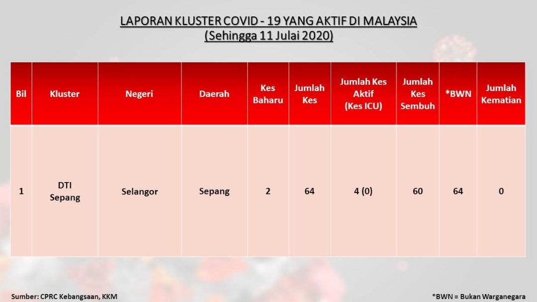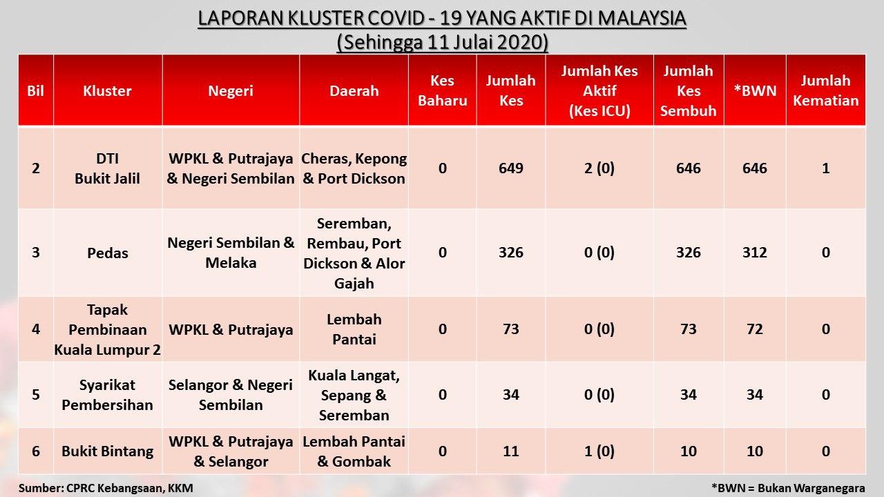 Laporan Kluster COVID-19 Aktif Di Malaysia 11/07/2020 Asrul Siaran Media 11 Julai 2020 Jumlah paparan: 665 Rating: ( 0 Rating ) Sila beri kadar Undi 1 Undi 2 Undi 3 Undi 4 Undi 5 Facebook Twitter Seterusnya Seterusnya