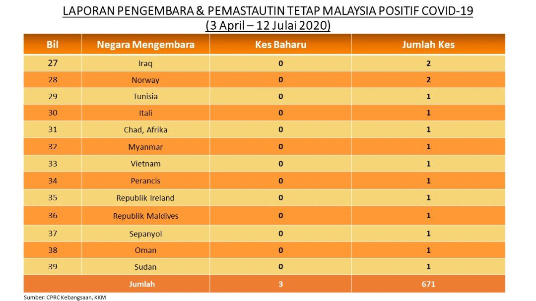 Laporan Pengembara & Pemastautin Tetap Malaysia Positif COVID-19 12/07/2020 Asrul Siaran Media 12 Julai 2020 Jumlah paparan: 884 Rating: ( 0 Rating ) Sila beri kadar Undi 1 Undi 2 Undi 3 Undi 4 Undi 5 Facebook Twitter Seterusnya Seterusnya