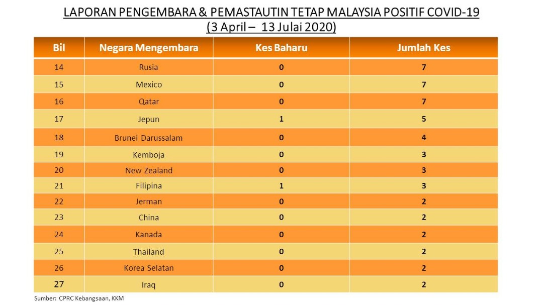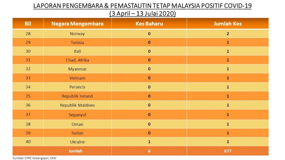 Laporan Pengembara & Pemastautin Tetap Malaysia Positif COVID-19 13/07/2020 Asrul Siaran Media 13 Julai 2020 Jumlah paparan: 666 Rating: ( 0 Rating ) Sila beri kadar Undi 1 Undi 2 Undi 3 Undi 4 Undi 5 Facebook Twitter Seterusnya Seterusnya