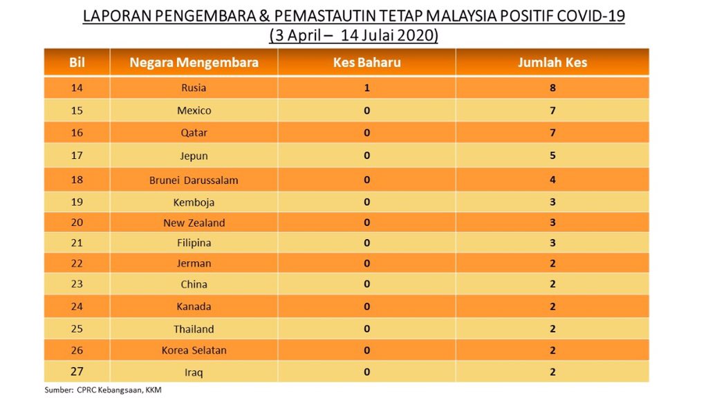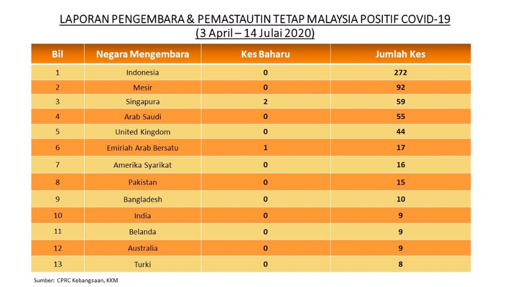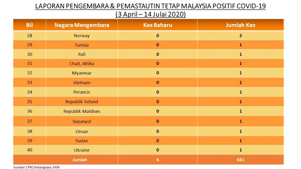 Laporan Pengembara & Pemastautin Tetap Malaysia Positif COVID-19 14/07/2020 Asrul Siaran Media 14 Julai 2020 Jumlah paparan: 818 Rating: ( 0 Rating ) Sila beri kadar Undi 1 Undi 2 Undi 3 Undi 4 Undi 5 Facebook Twitter Seterusnya Seterusnya