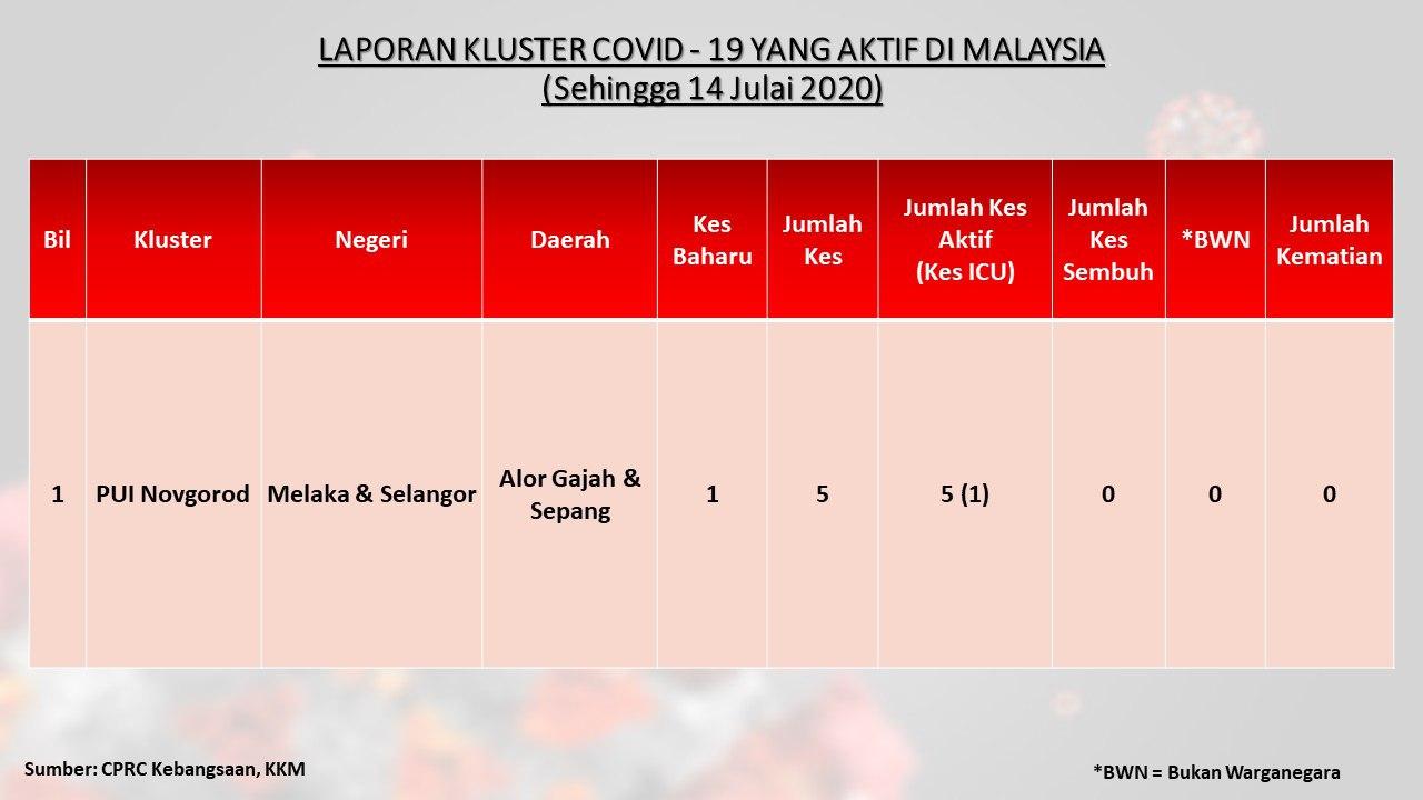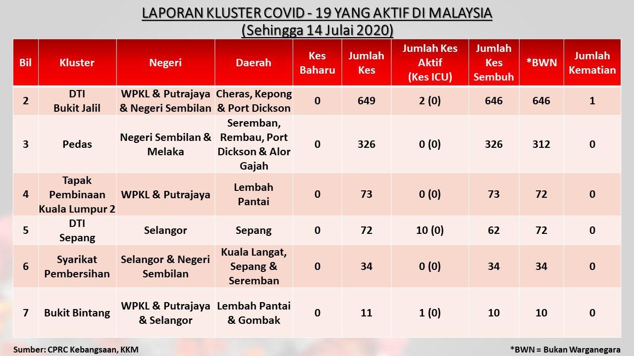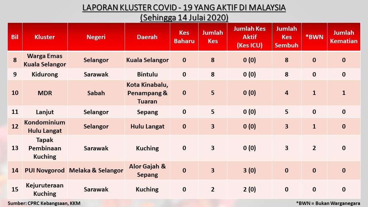 Laporan Kluster COVID-19 Aktif Di Malaysia 14/07/2020 Asrul Siaran Media 14 Julai 2020 Jumlah paparan: 711 Rating: ( 0 Rating ) Sila beri kadar Undi 1 Undi 2 Undi 3 Undi 4 Undi 5 Facebook Twitter Seterusnya Seterusnya