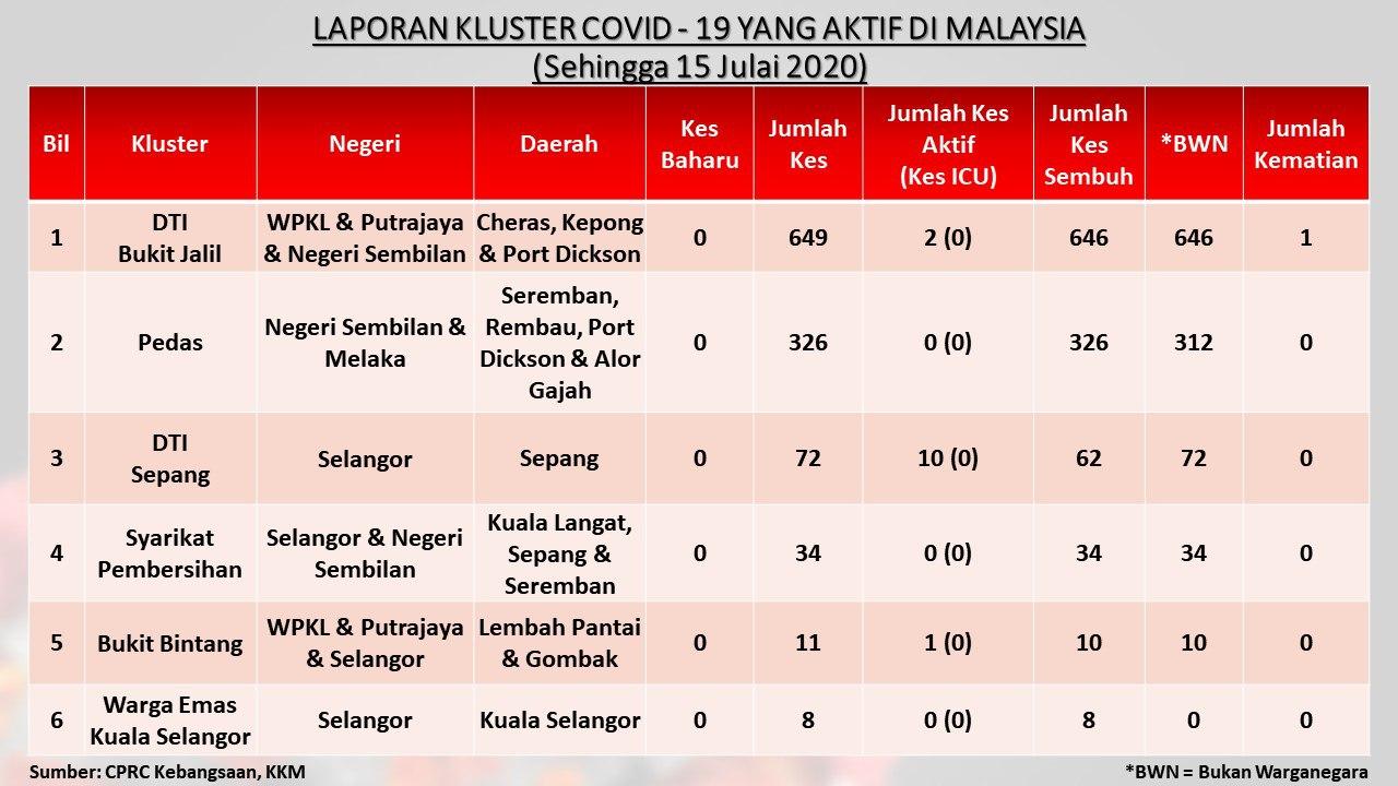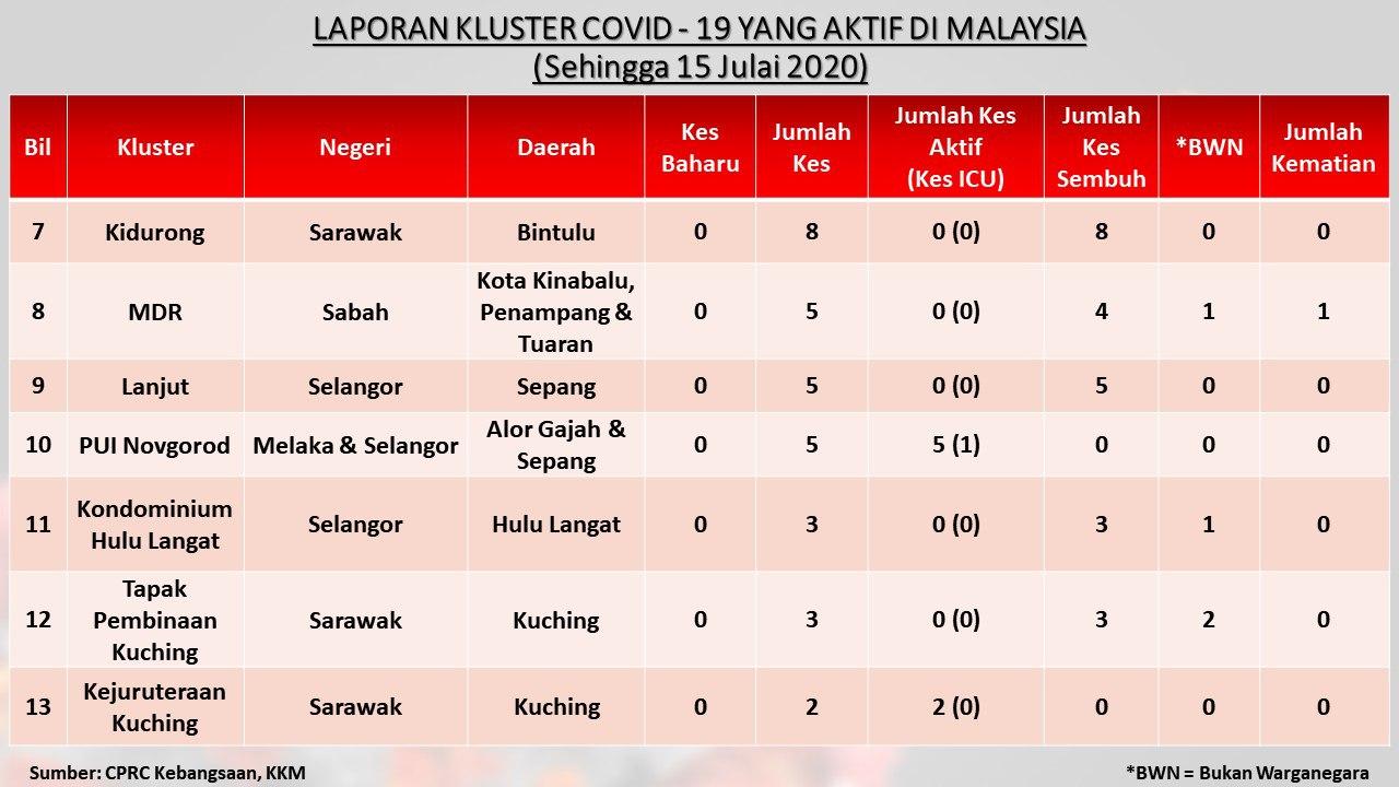 Laporan Kluster COVID-19 Aktif Di Malaysia 15/07/2020 Asrul Siaran Media 15 Julai 2020 Jumlah paparan: 946 Rating: ( 0 Rating ) Sila beri kadar Undi 1 Undi 2 Undi 3 Undi 4 Undi 5 Facebook Twitter Seterusnya Seterusnya