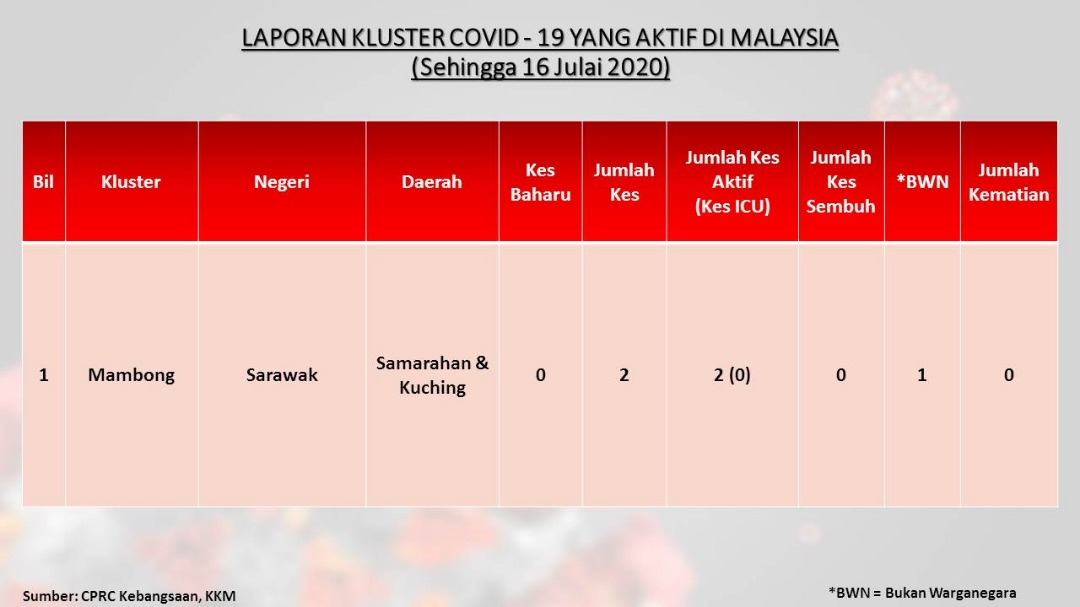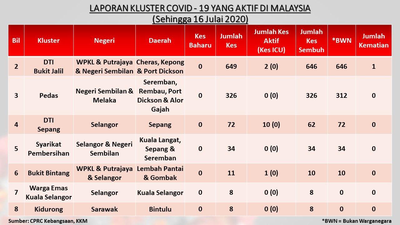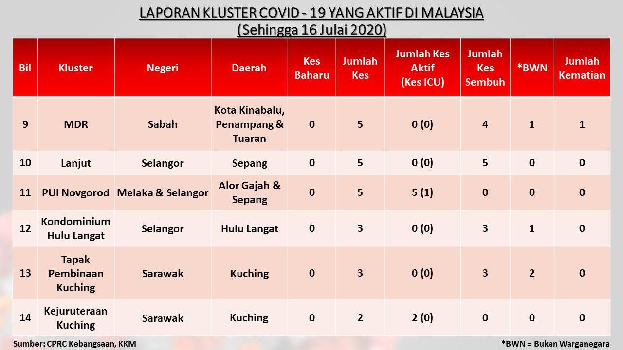 Laporan Kluster COVID-19 Aktif Di Malaysia 16/07/2020 Asrul Siaran Media 16 Julai 2020 Jumlah paparan: 583 Rating: ( 0 Rating ) Sila beri kadar Undi 1 Undi 2 Undi 3 Undi 4 Undi 5 Facebook Twitter Seterusnya Seterusnya