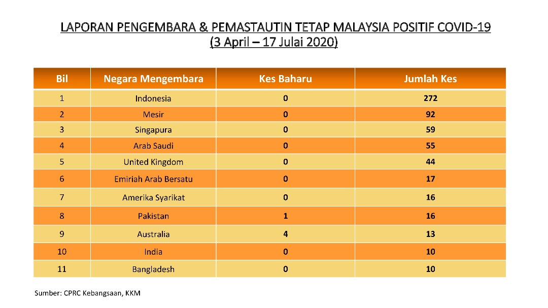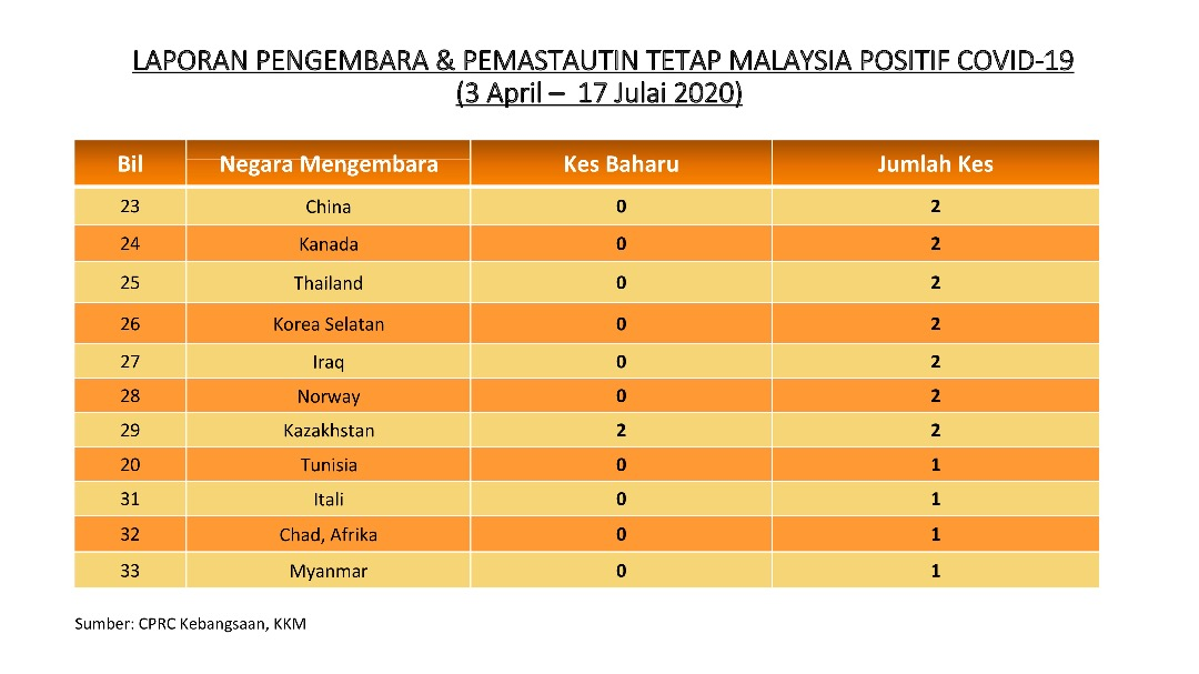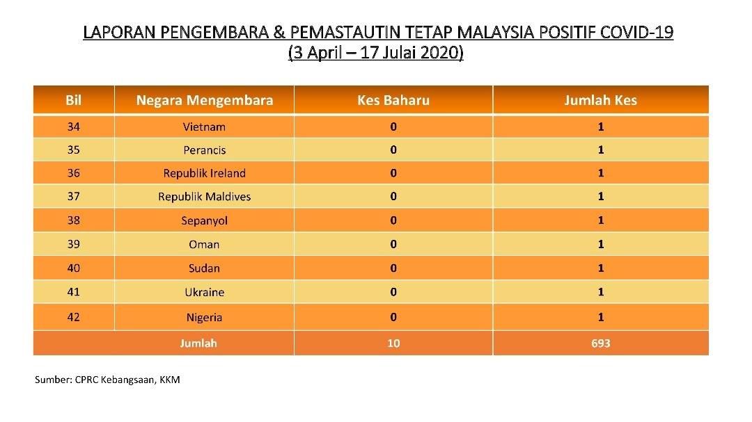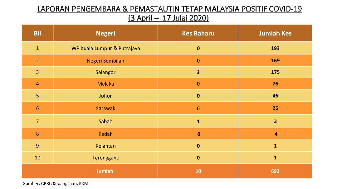 Laporan Pengembara & Pemastautin Tetap Malaysia Positif COVID-19 17/07/2020 Asrul Siaran Media 17 Julai 2020 Jumlah paparan: 728 Rating: ( 0 Rating ) Sila beri kadar Undi 1 Undi 2 Undi 3 Undi 4 Undi 5 Facebook Twitter Seterusnya Seterusnya