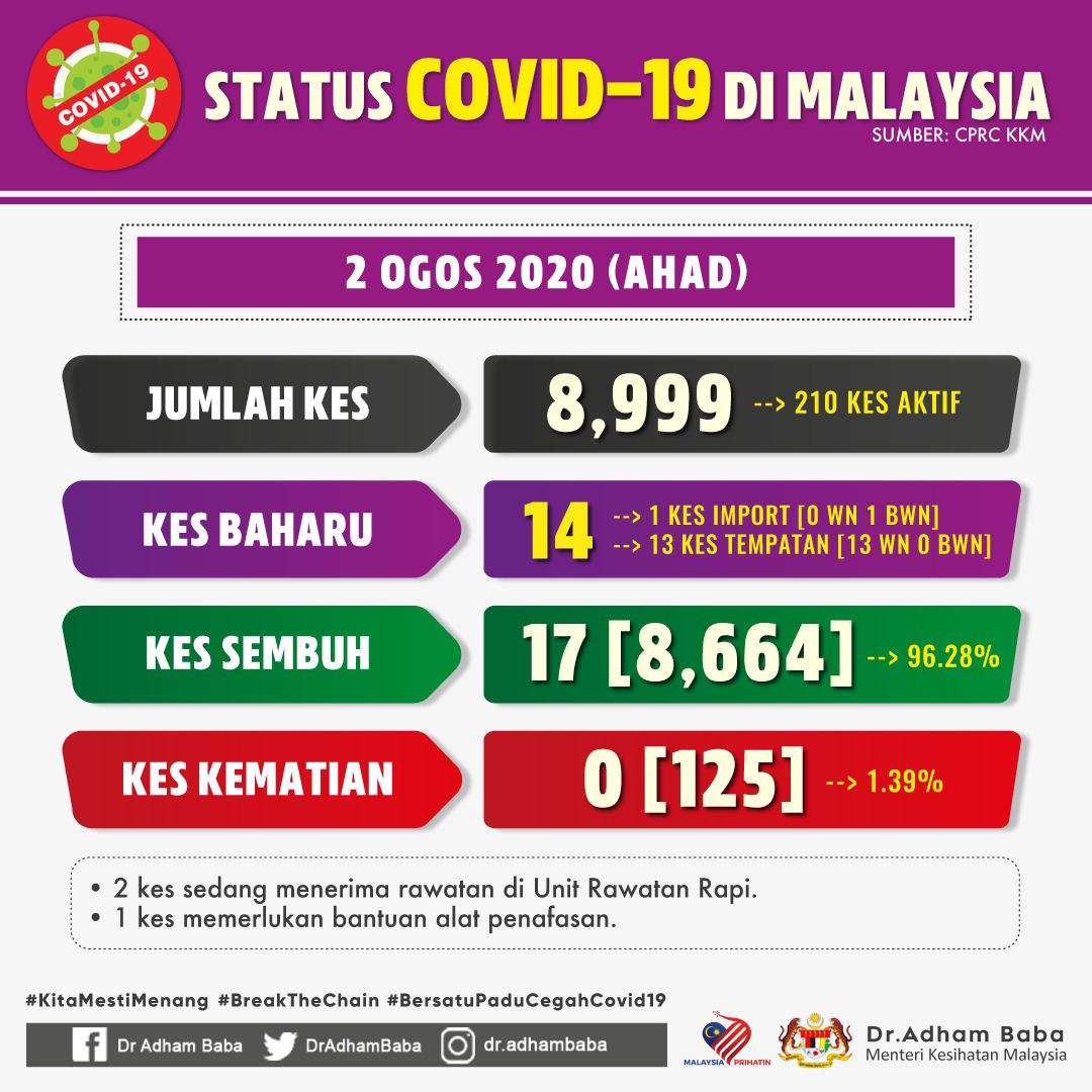 Status COVID-19 Di Malaysia 02/08/2020 Asrul Siaran Media 02 Ogos 2020 Jumlah paparan: 806 Rating: ( 0 Rating ) Sila beri kadar Undi 1 Undi 2 Undi 3 Undi 4 Undi 5 Facebook Twitter Seterusnya Seterusnya
